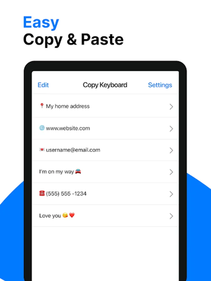 Add frequently used notes, emails, locations, bank accounts to Copy Keyboard - Paste Keyboard