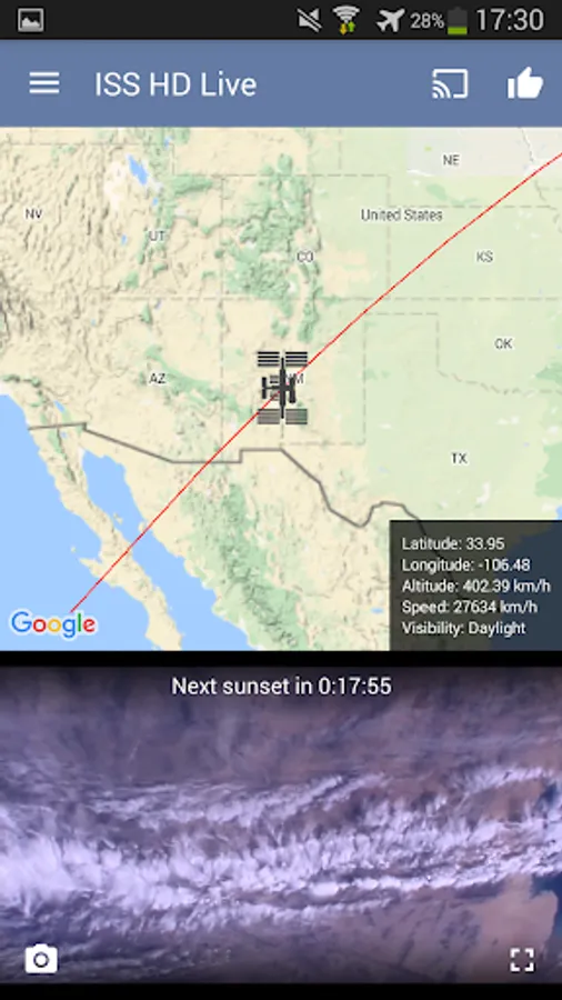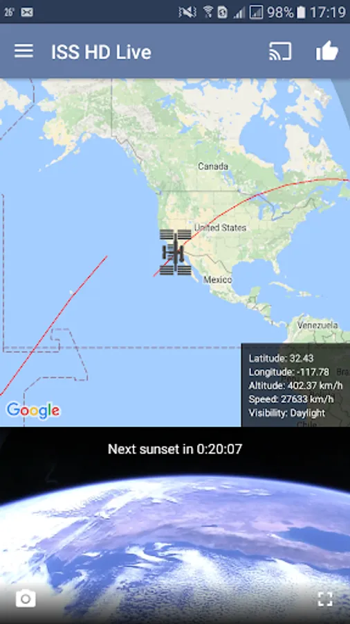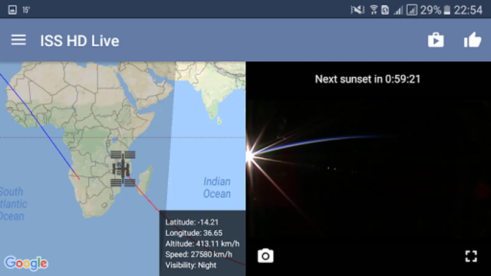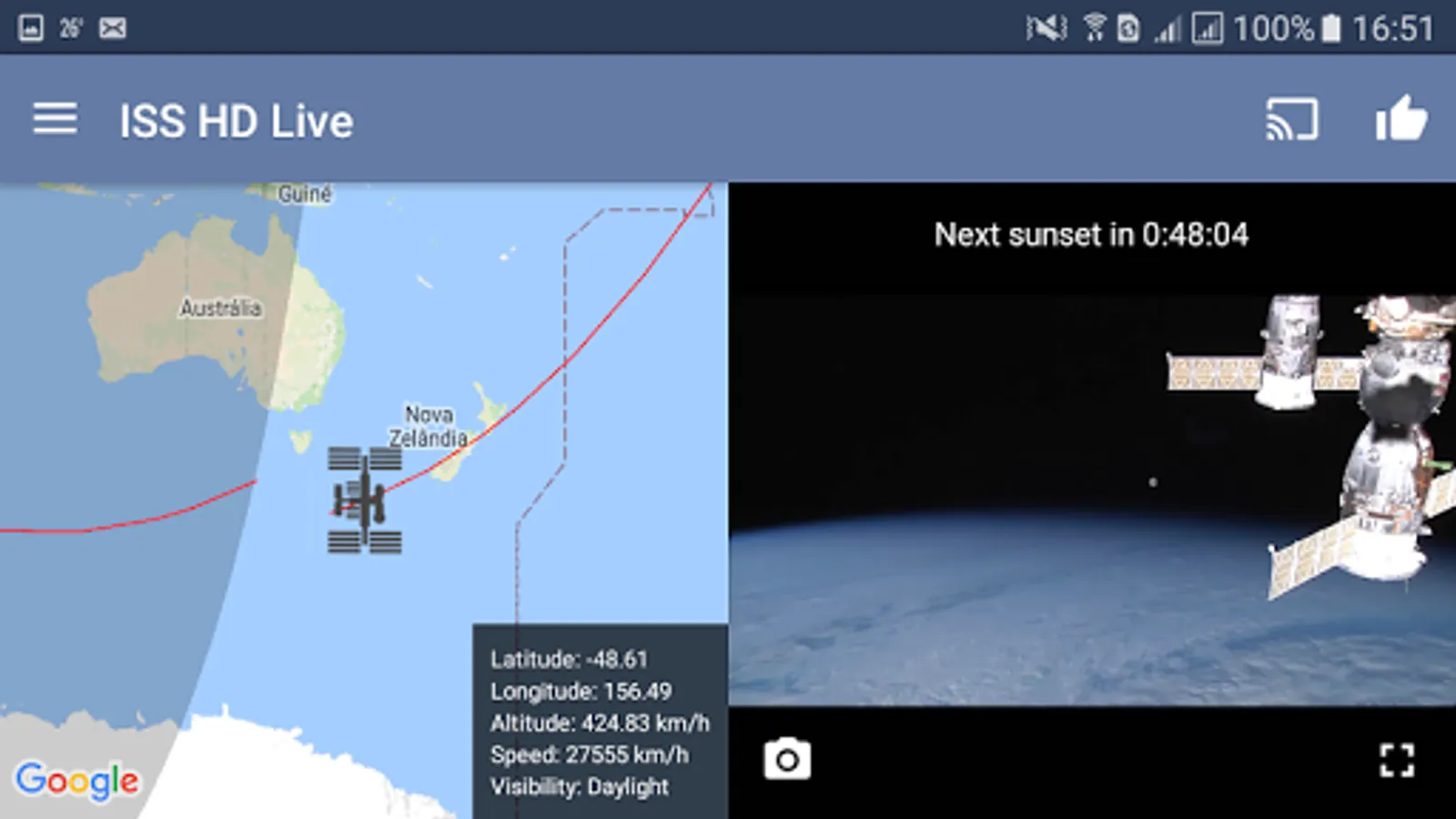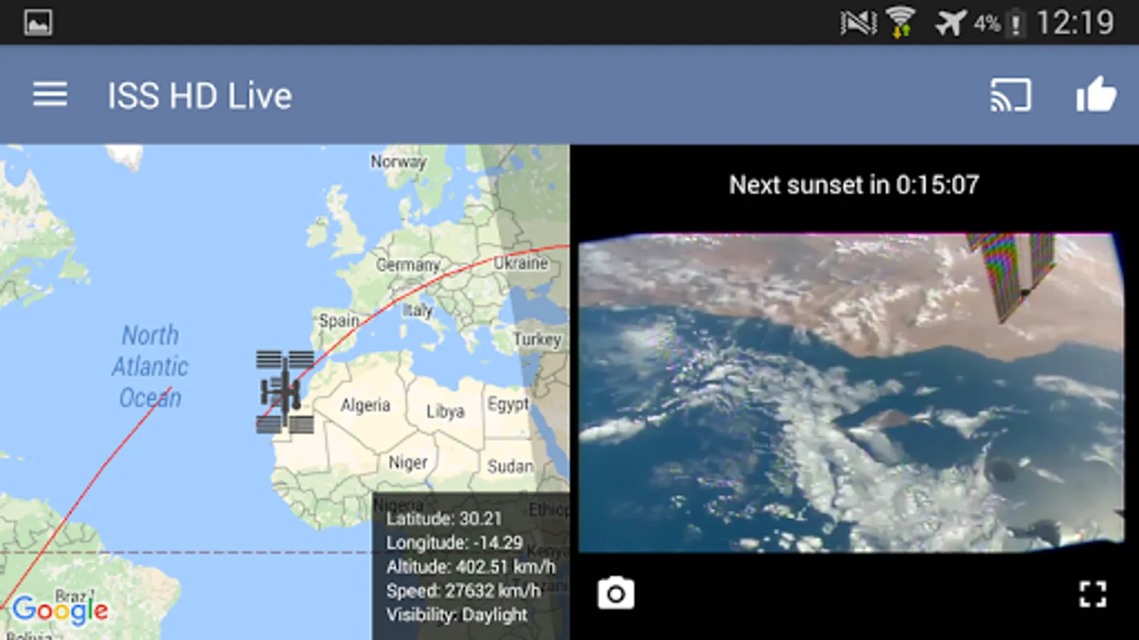 ISS HD Live allows you to watch live video feed of the Earth from International Space Station directly on your android phone or tablet. ISS HD live offers you an exciting experience where everything is thoroughly thought and designed, the complete app that shows Earth video streaming about 400 km above it, with a lot of options fully customizable.