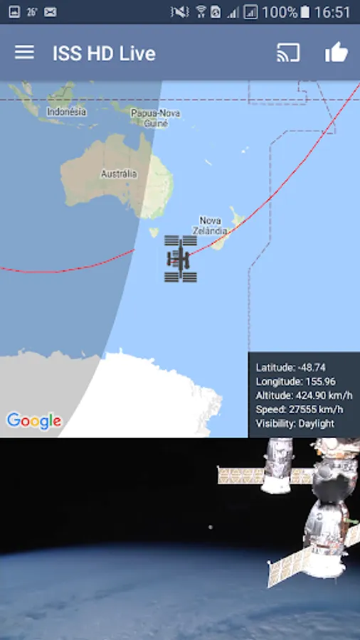 The app has integrated the native Android Google Map in it, where you can follow the ISS orbit around our planet, zoom, rotate, drag, tilt the map. Also, you can choose between different types of map, like Satellite or Terrain, and an information window is also presented with data such as ISS speed, altitude, visibility, country above which ISS is right now, latitude and longitude. Everything is customizable from settings menu.