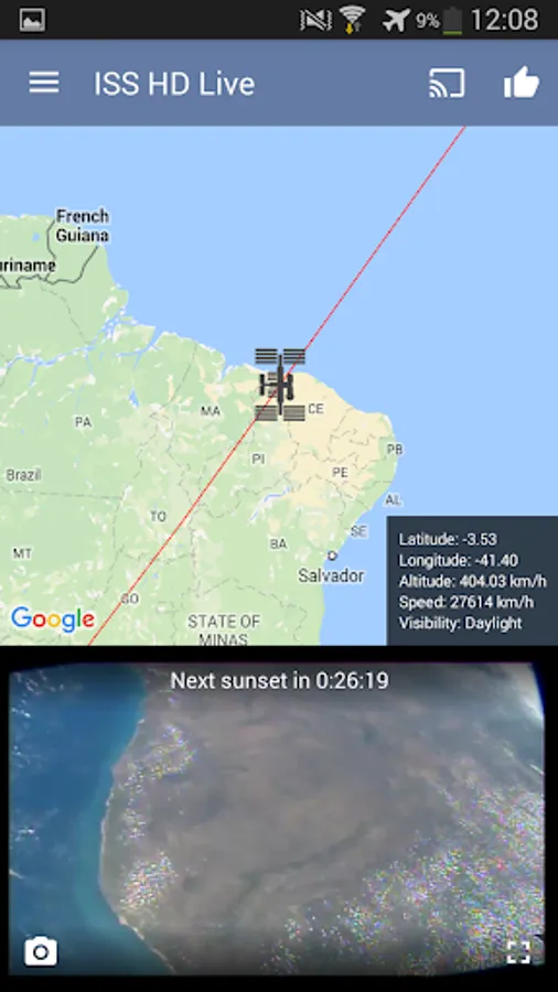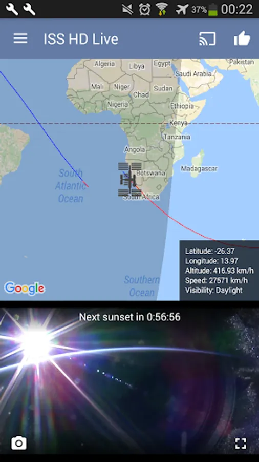 The app utilizes the native Android Google Map (ISS tracker), which allows you to follow the Space Station’s orbit around our planet. You can zoom, rotate, drag and tilt the map; choose between different types of maps (such as satellite or terrain); and view data such as the speed of orbit, altitude, visibility, latitude and longitude, and even what country the Station is above at any moment in time. All of these options are easily customizable from the settings menu.