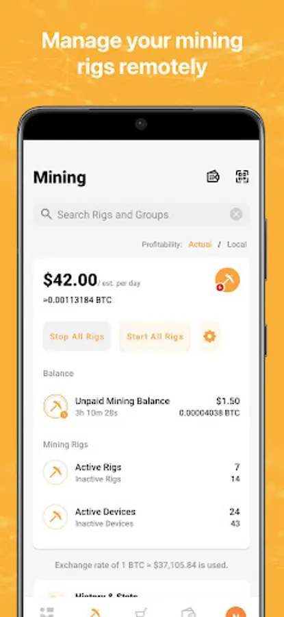 Manage and monitor your mining rigs remotely, keep an eye on temperatures, start and stop mining, and change power settings easily on the go.