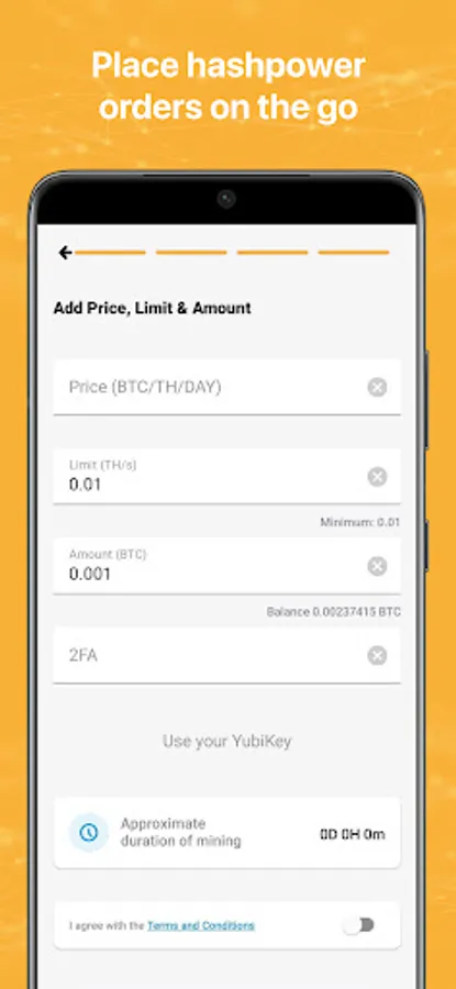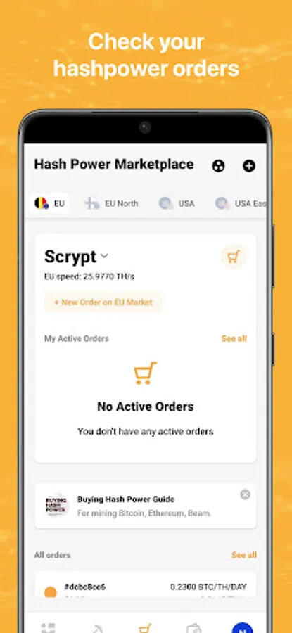 Check the status of your hashpower orders, place new orders, and manage or cancel existing orders easily on the go.