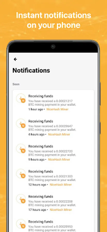 Deposit or withdraw over 60 cryptocurrencies and check your wallet activities. Please note that this is not a mobile cryptocurrency wallet, no seed phrases are stored on your device. NiceHash provides a secure custodial wallet for all users.
