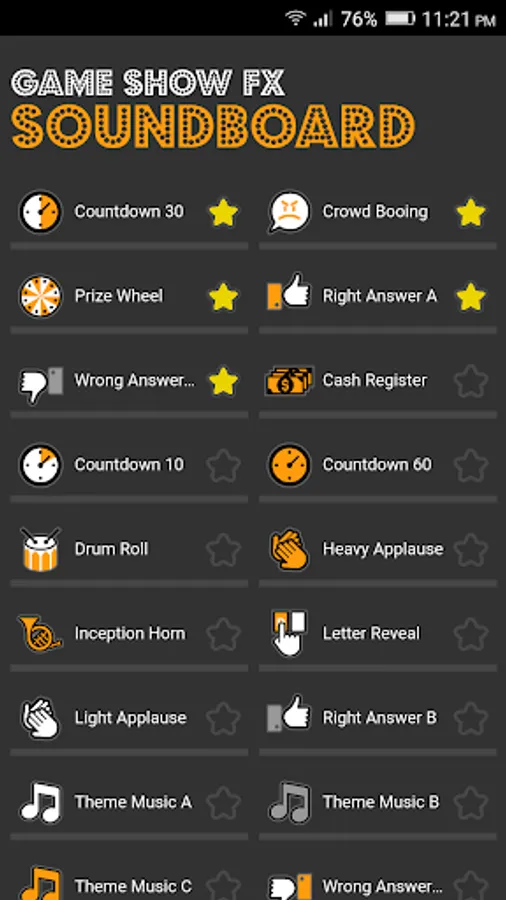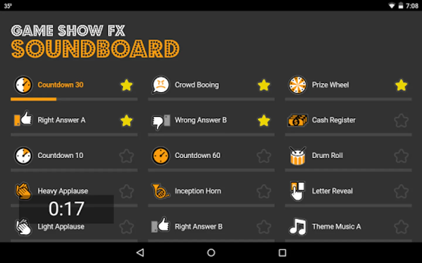 Game Show FX Soundboard brings the excitement of a high-production game show to your Android device. Sounds like prize wheels, dramatic countdowns, correct answer tones, and wrong answer buzzers are sure to intensify your event regardless of the consolation prize! Soundboard features include:
