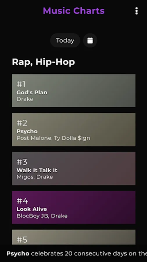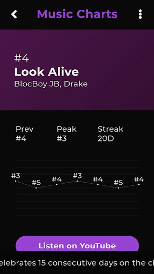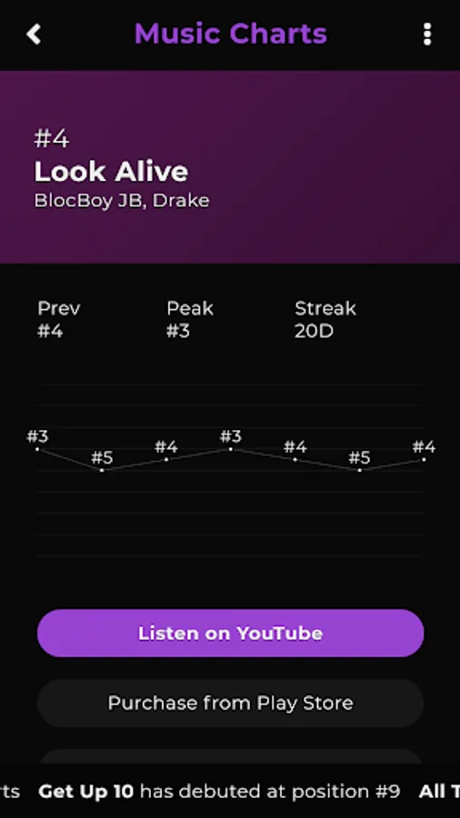 While browsing our lists, just tap any track for access to additional song details as well as links to lyrics and music videos. Also provided are legitimate MP3 download links from popular streaming services and on-demand marketplaces, along with a handy graph that quickly illustrates how your favorite song has performed over the past week.