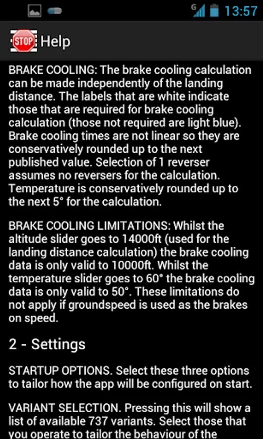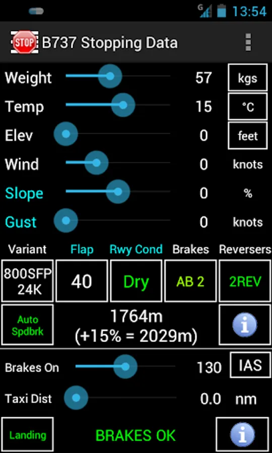 The app also provides Brake Cooling information for takeoff and landing. The brake cooling tables with its four way interpolation requirement is a nightmare to get right. This app allows for a quick cross check to make sure you haven't gone wrong.