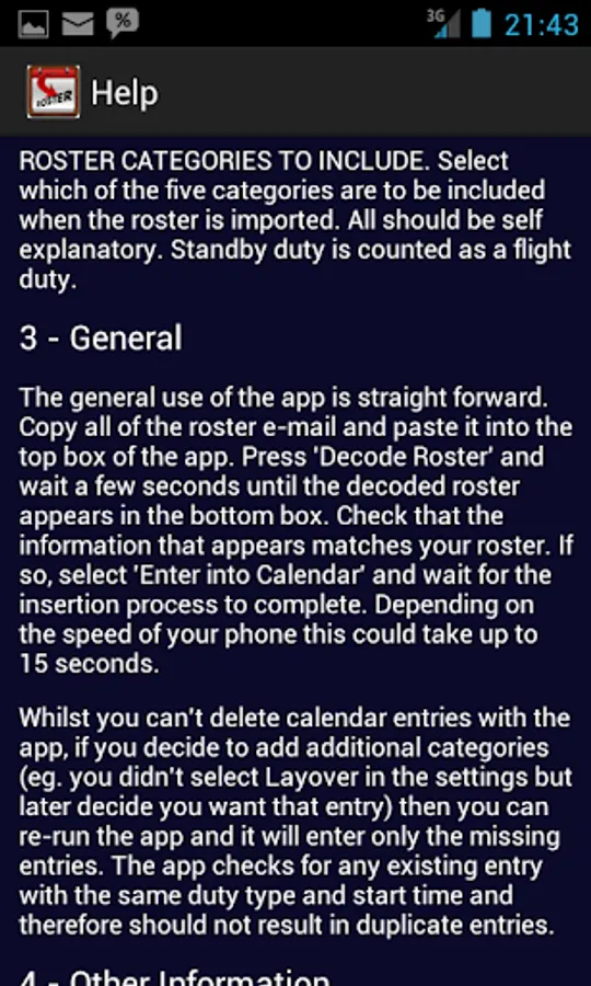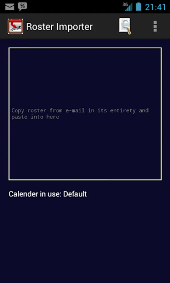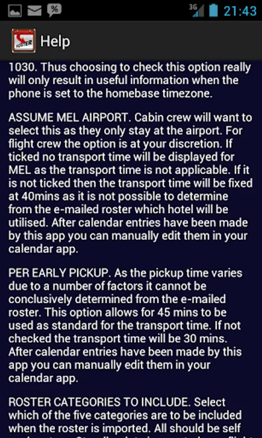 Virgin Australia Domestic Flight and Cabin Crew need an easy way to get that four week roster into their Android calendar. Until now you were stuck with manual entry or having to put everything in and then deleting what you didn't want. Roster Importer fixes that. Simply take the roster that is e-mailed to you and copy and paste it into this app. Then with a click of a button your calendar is populated with the events that you choose.