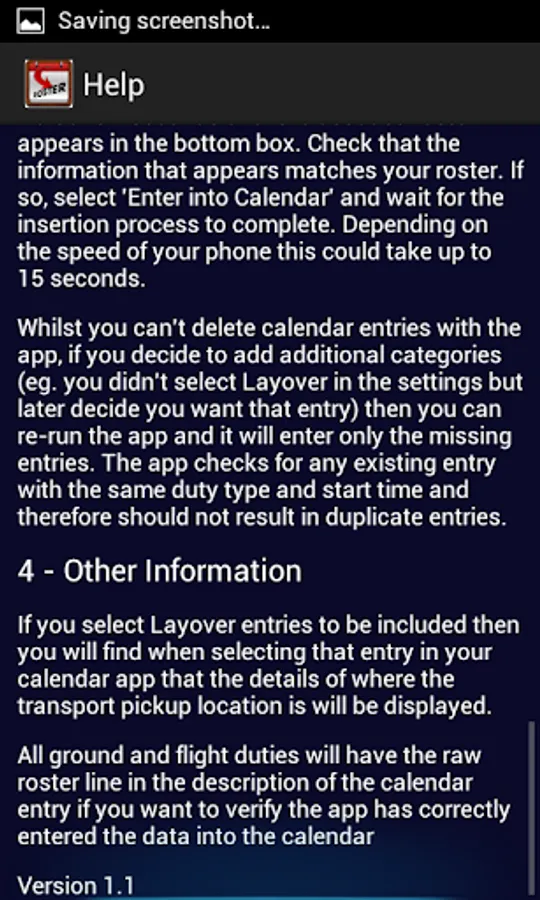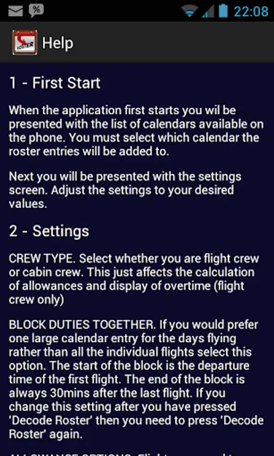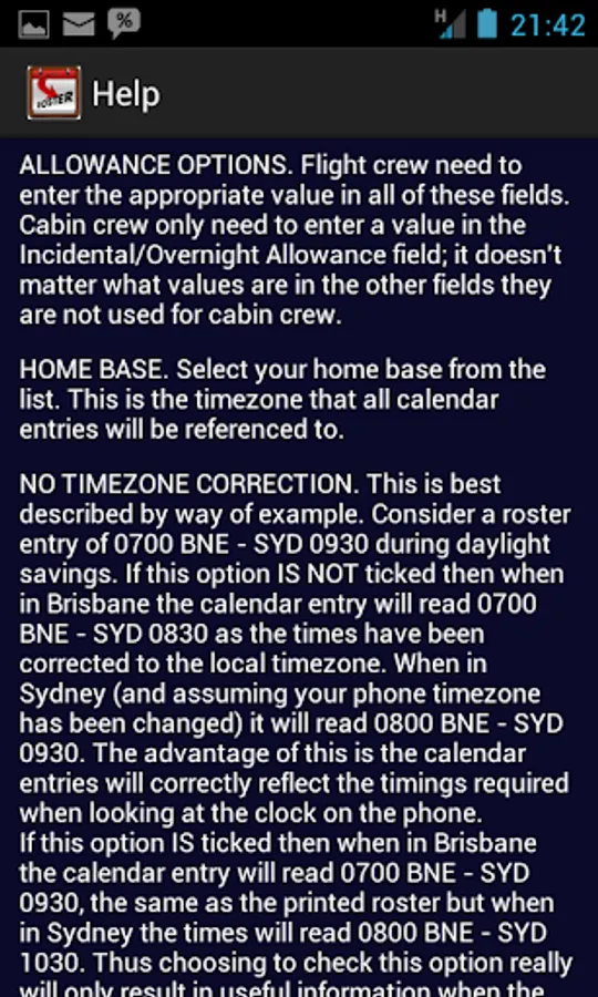 There is also an option for those that don't like all the individual flight duties listed in the calendar to have one large block of duty that spans from departure time to 30mins after last arrival. Android phones support multiple calendars so you can even insert the individual flights into one calendar and the blocks of duty into another which can be handy if you like one format but your partner likes the other.