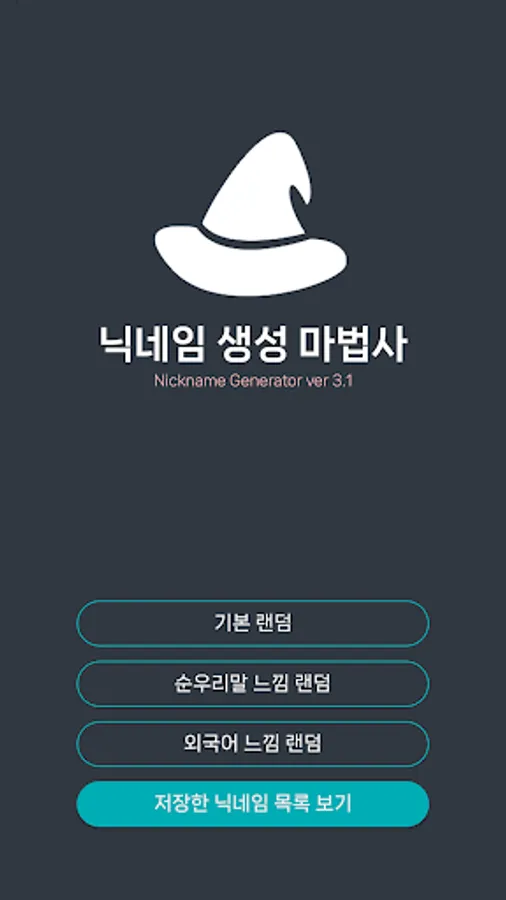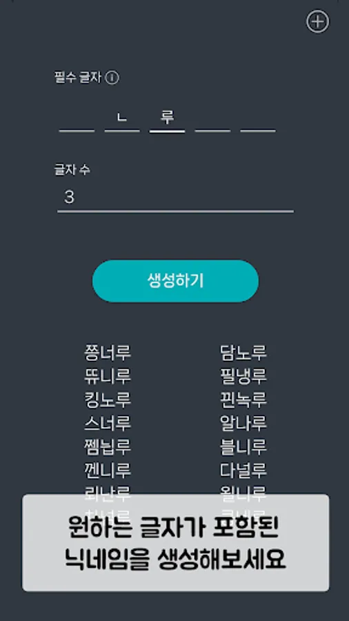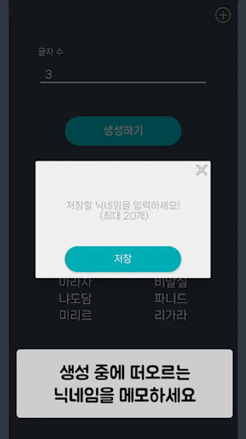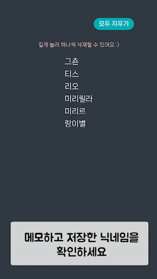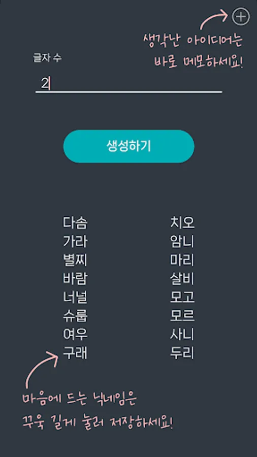 A nickname is randomly generated according to the initial consonant, letter, and length entered by the user. Press and hold the nickname you like in the middle to save it, and press the Memo button at the top right to write down the nickname that comes to mind.