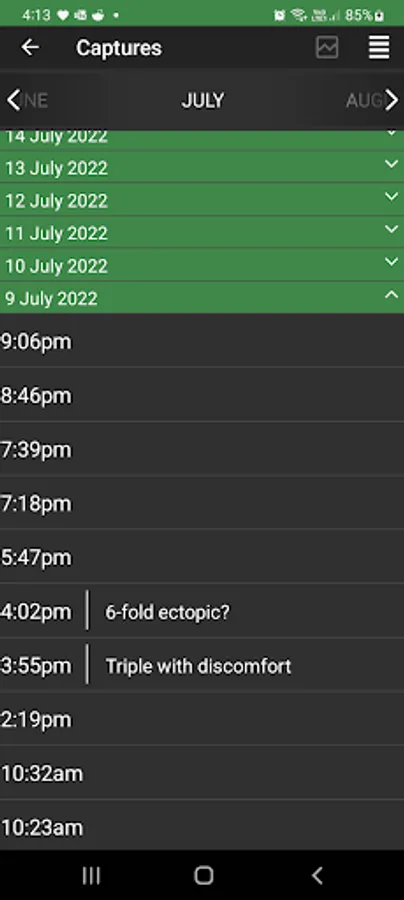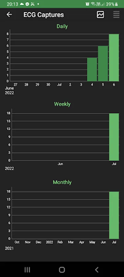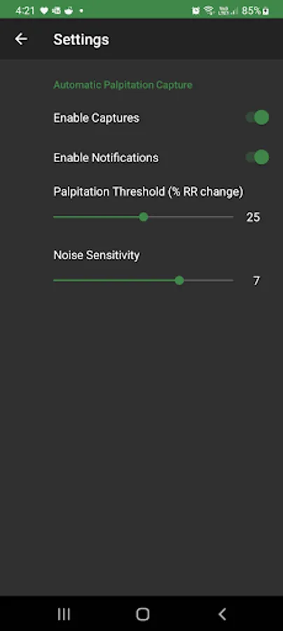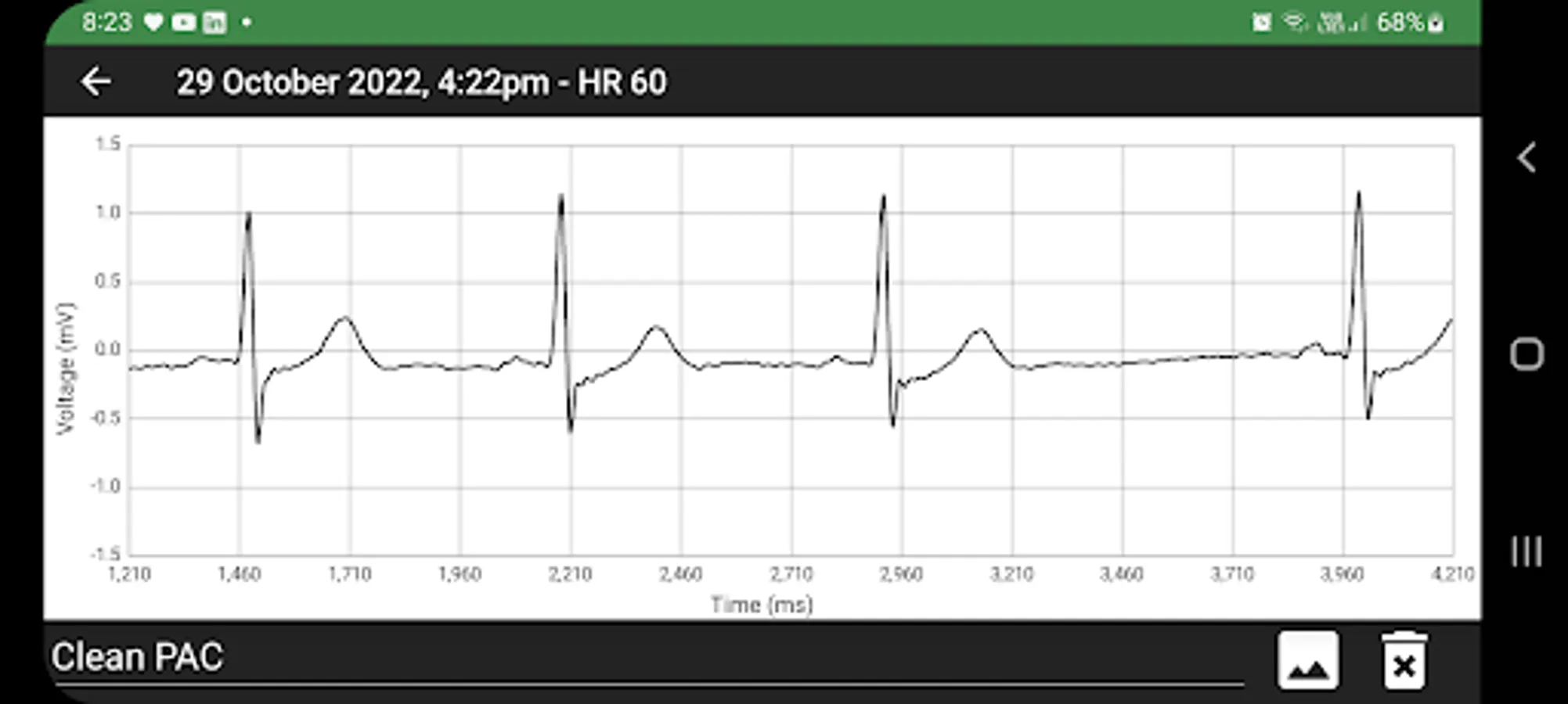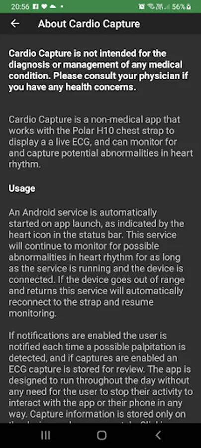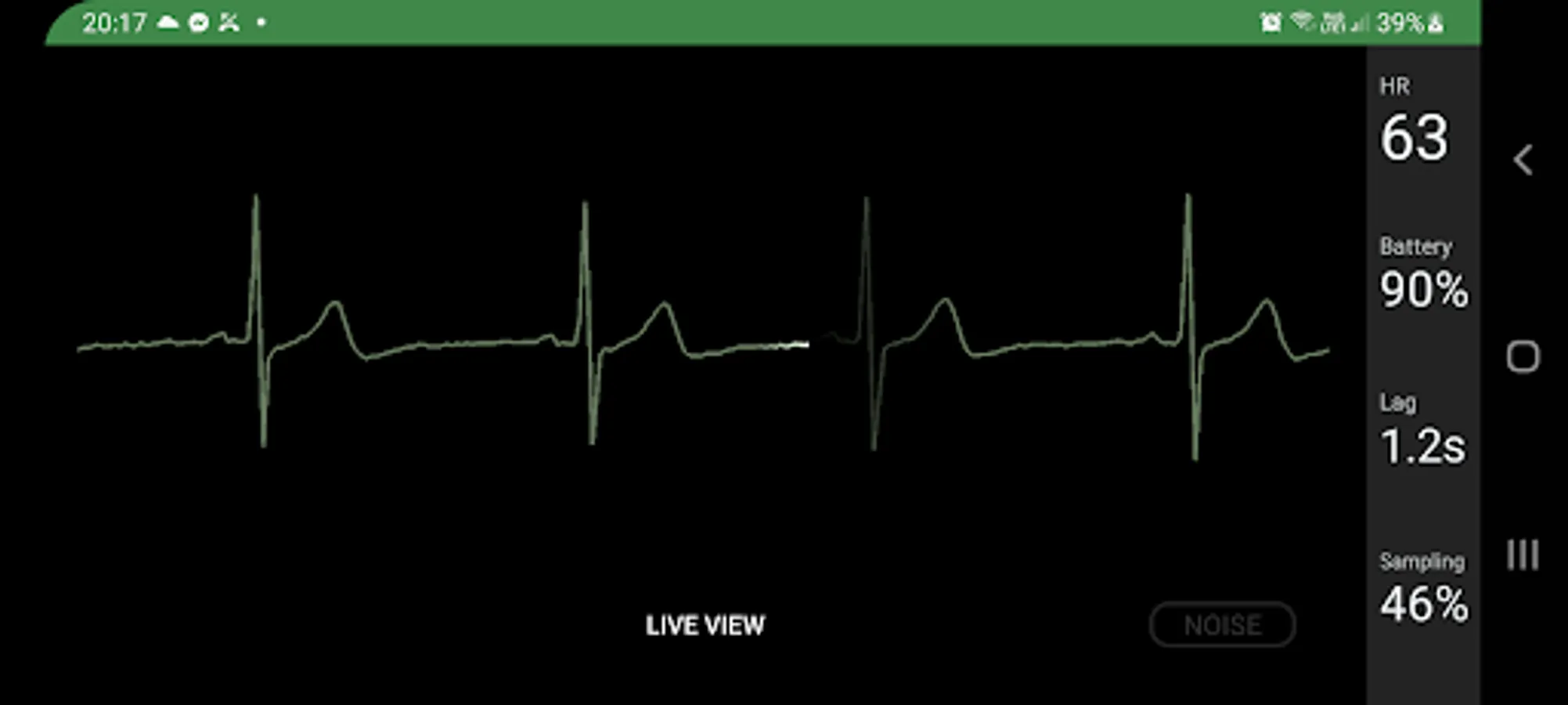 A non-medical app that works with the Polar H10 chest strap to display a smoothly-rendered live ECG, and can monitor for and capture potential abnormalities in heart rhythm. The user is notified each time a possible palpitation is detected and an ECG capture is stored for review. The app is designed to run throughout the day without any need for the user to stop their activity to interact with the app or their phone.