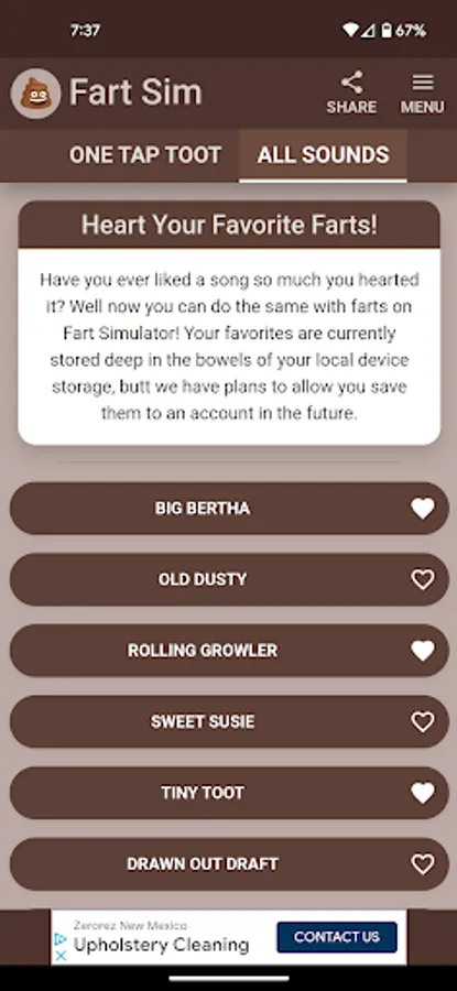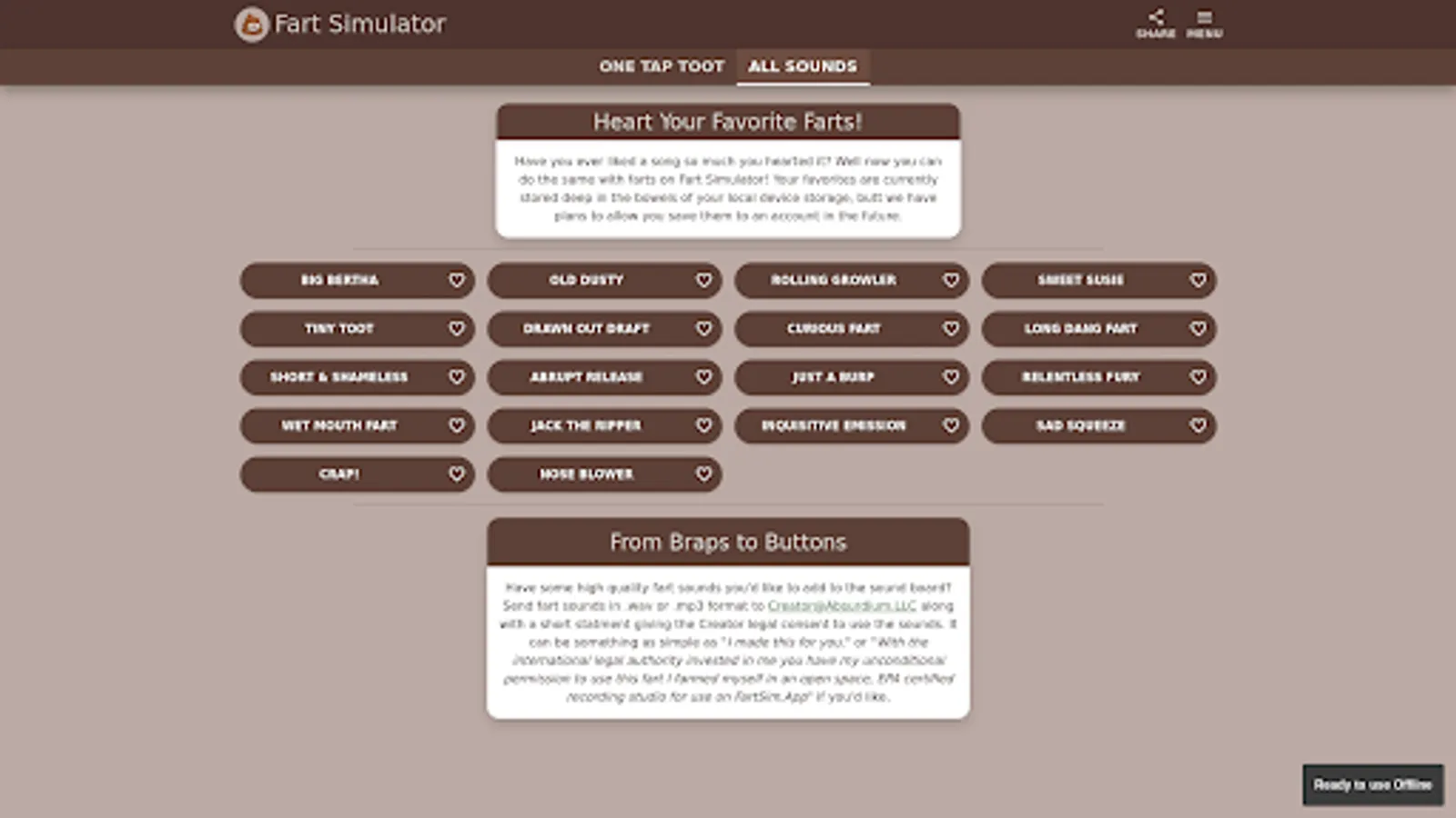 On the All Sounds page you can explore the whole library of farts from one convenient sound board. You can even "heart" your favorite fart sound buttons.