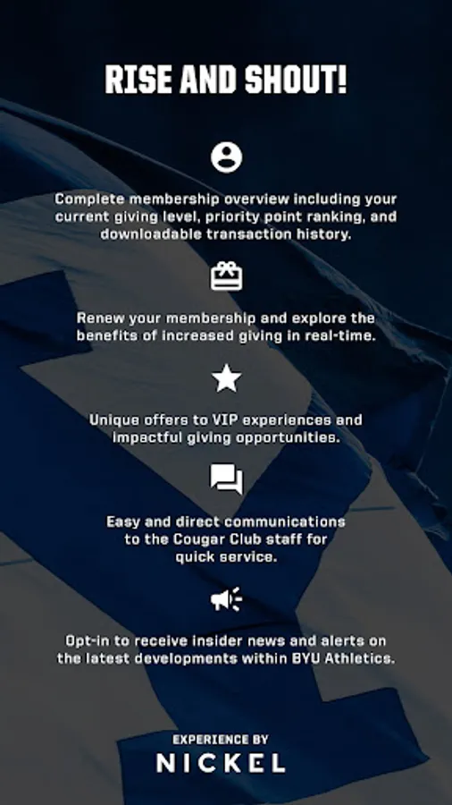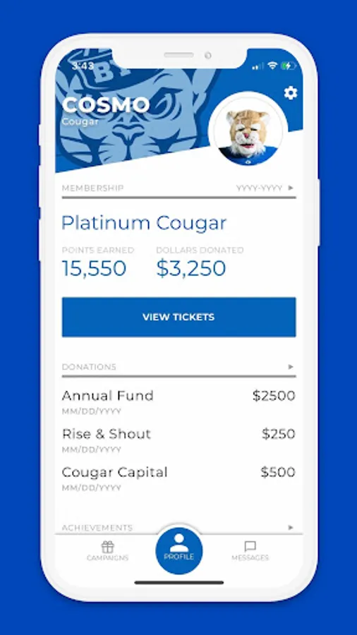 Designed exclusively for members of the BYU Cougar Club to improve the donor experience. Members now have mobile access to membership status, priority point rankings, giving history, customized giving opportunities and exclusive experiences. Additionally, members can easily manage their membership, receive first-look and exclusive content, and enjoy direct communications with Cougar Club staff from their mobile devices.