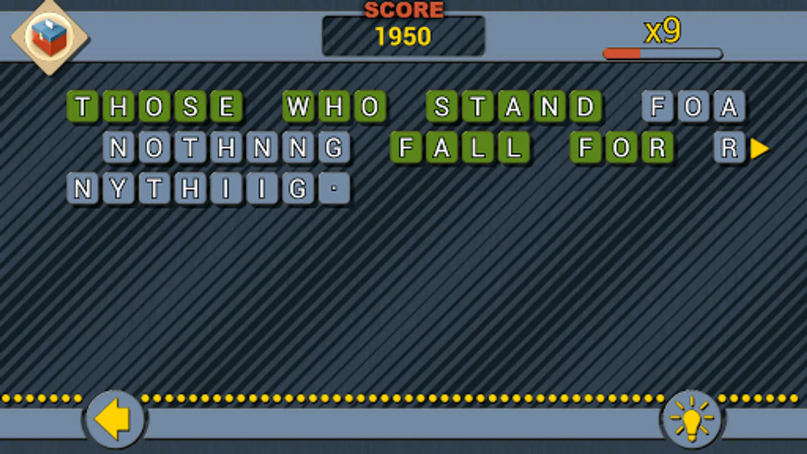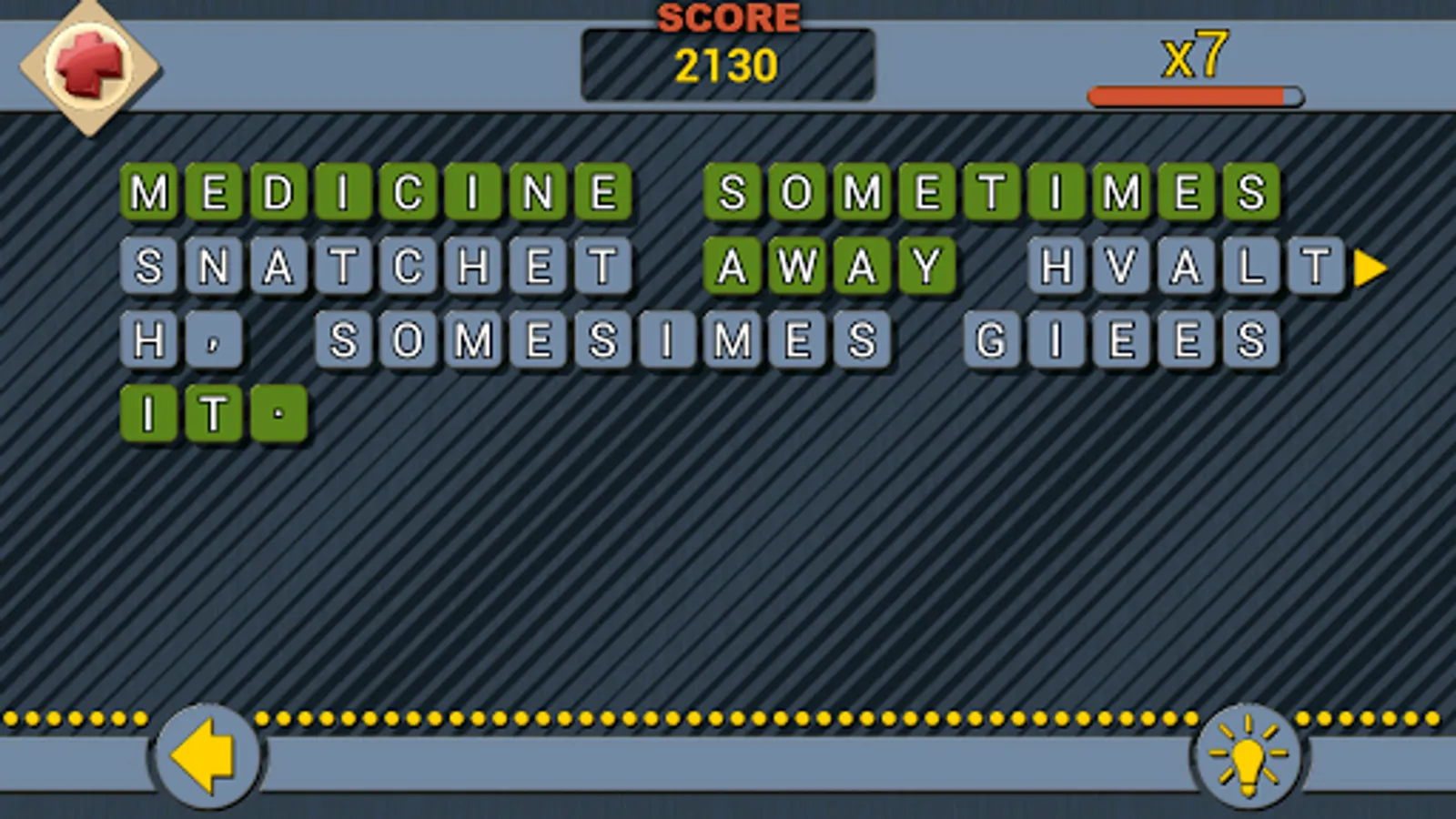 Quotables is a relaxing word game where you identify and assemble scrambled quotes. Each word puzzle consists of a famous saying that is spelled out on the board with letter tiles. The letter tiles are then shuffled vertically within each column on the board to scramble the words. You must rearrange the tiles in each column to connect the letters in the correct order and restore the original saying.