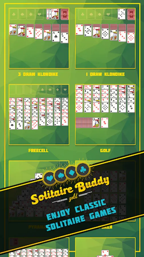 Solitaire Buddy Gold is a collection of classic solitaire card games done right! Klondike, Spider, Freecell and more come together in this solitaire suite.