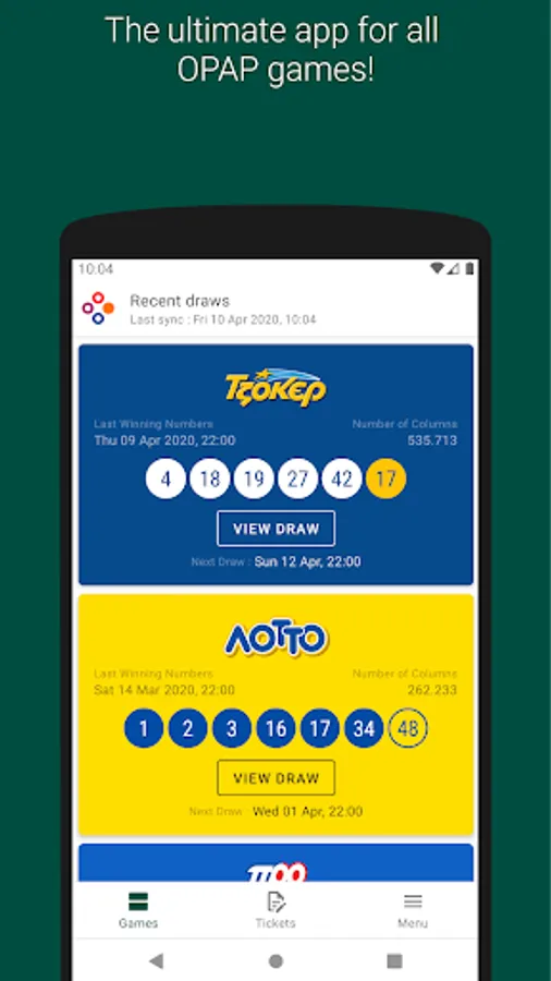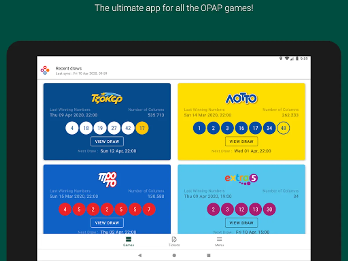 DISCLAIMER: This app is just a tool for all OPAP games players. Users cannot actually play the OPAP games from inside the app and they cannot gain or spend any money inside the app in any way!