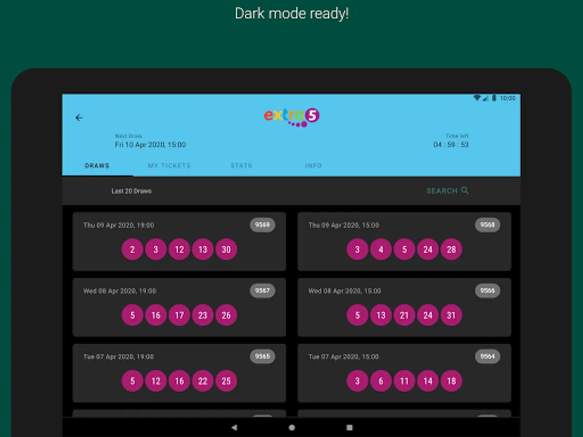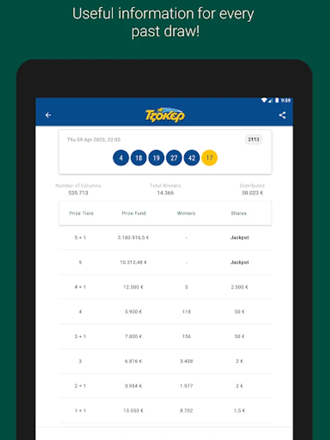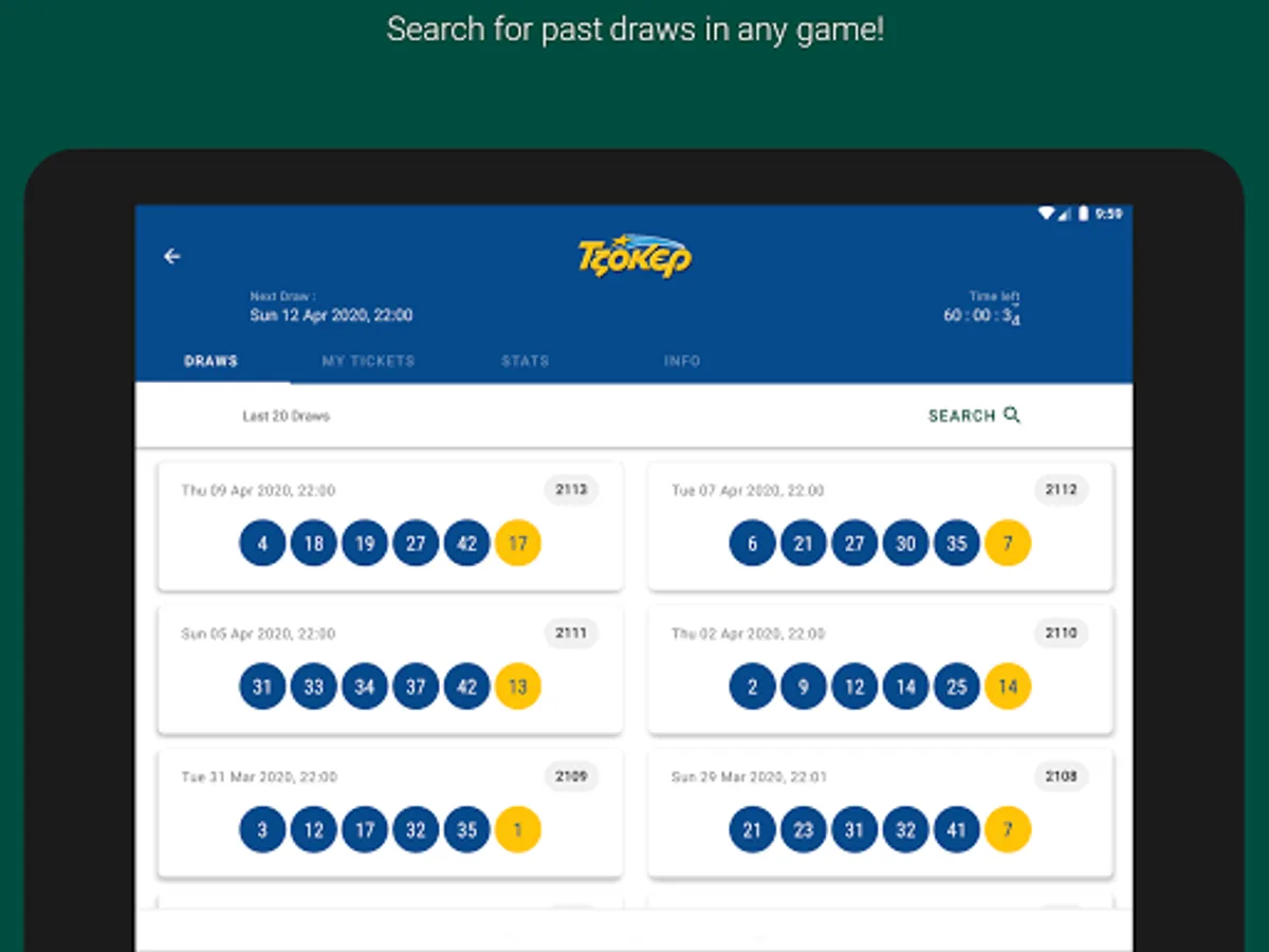 Draw updates happen in real time so that you always stay up to date and you can even search for every past draw for every lottery!