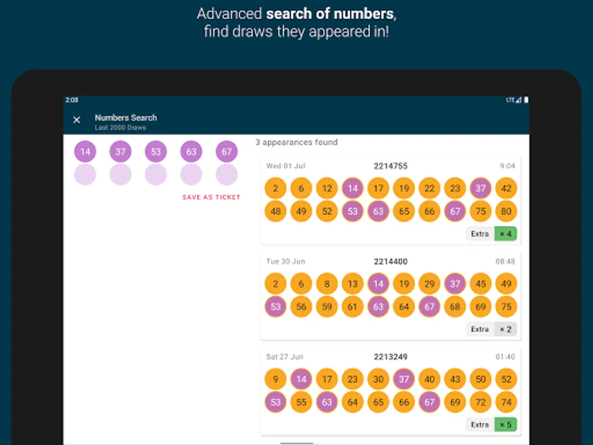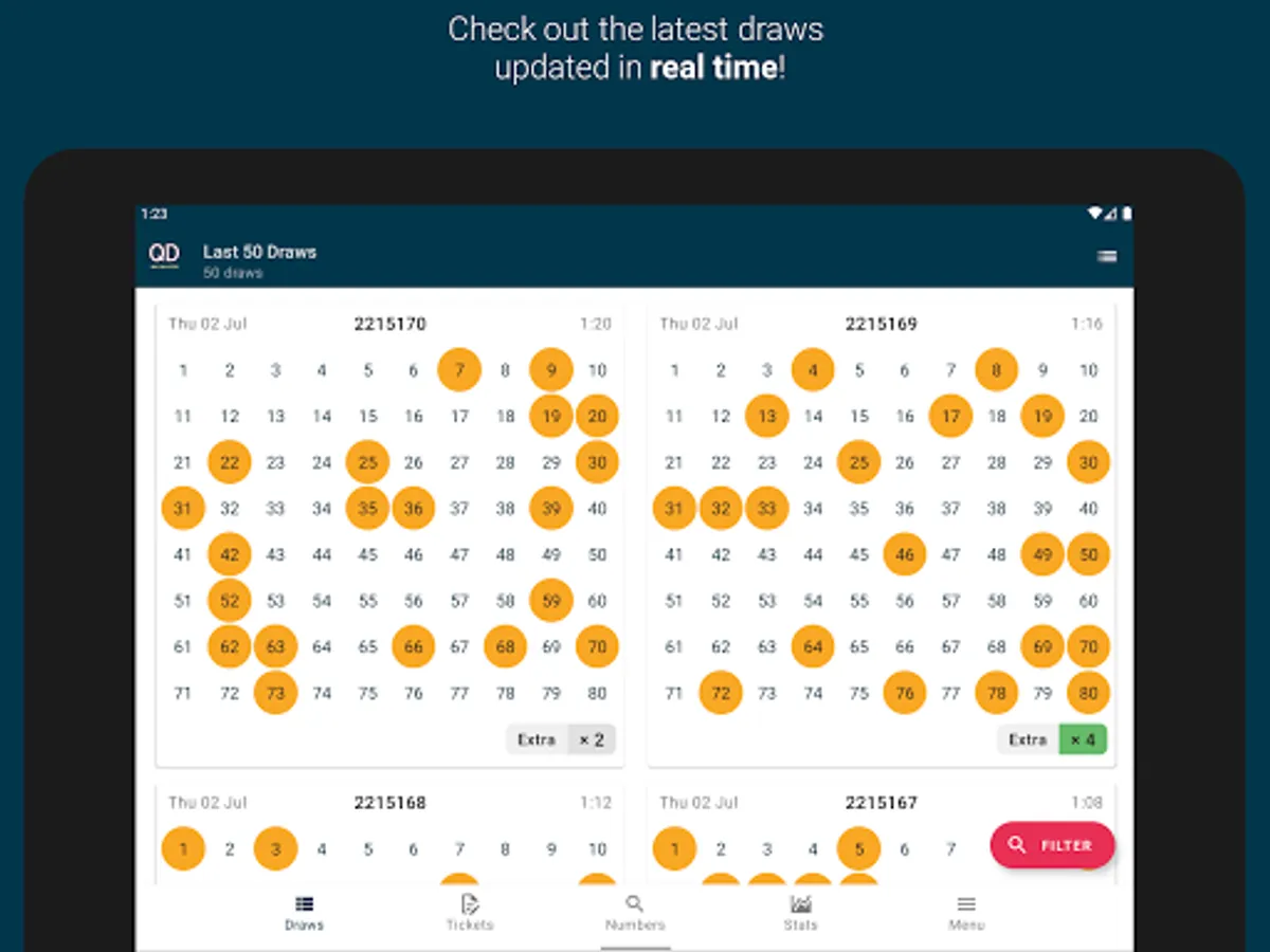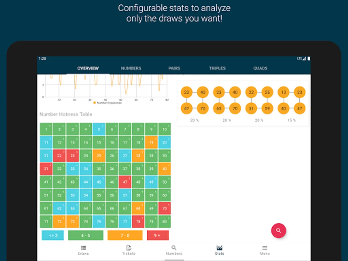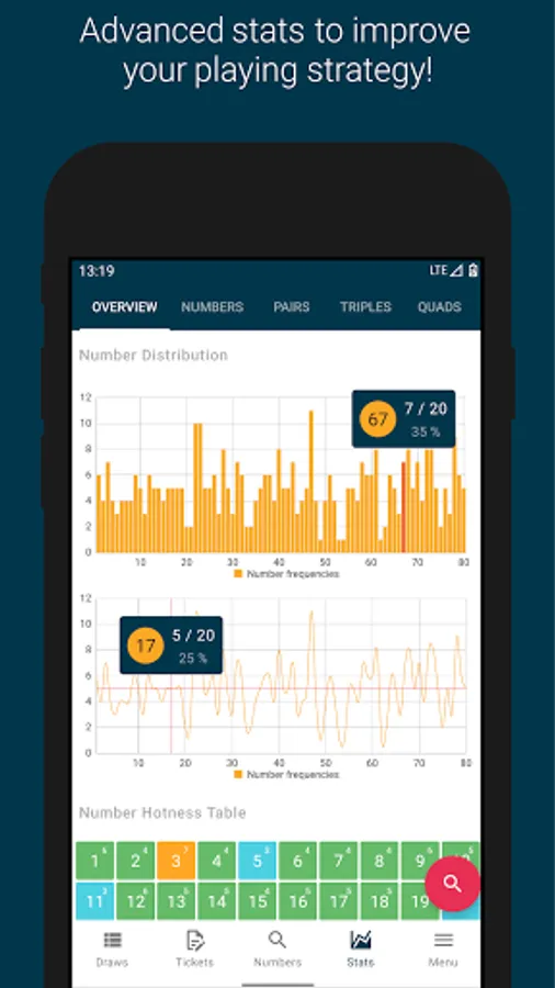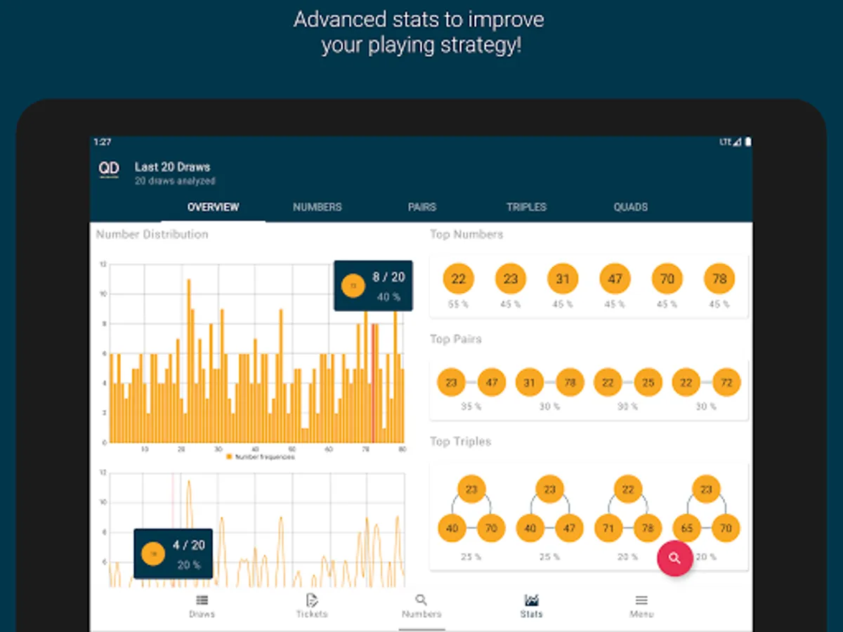 - View advanced stats, including top pairs, triples and quads for your selected draw range! This way you can improve your playing strategy and increase your winnings!.