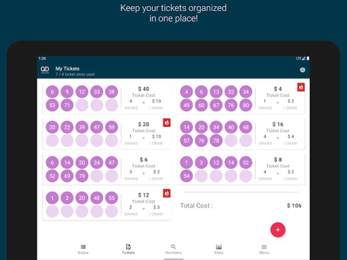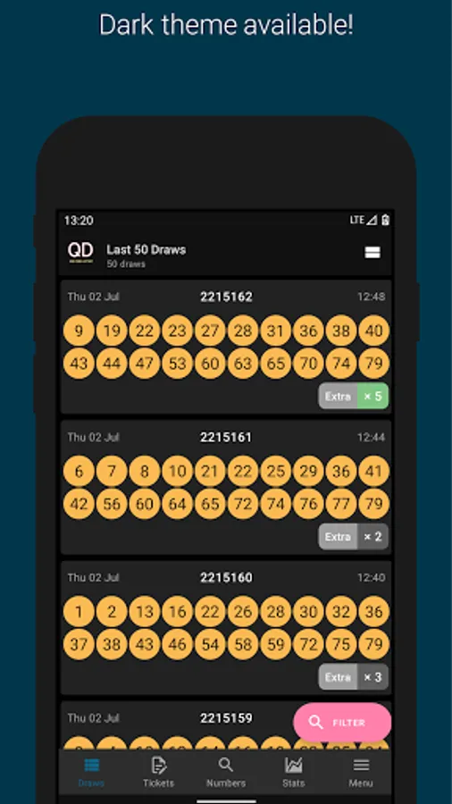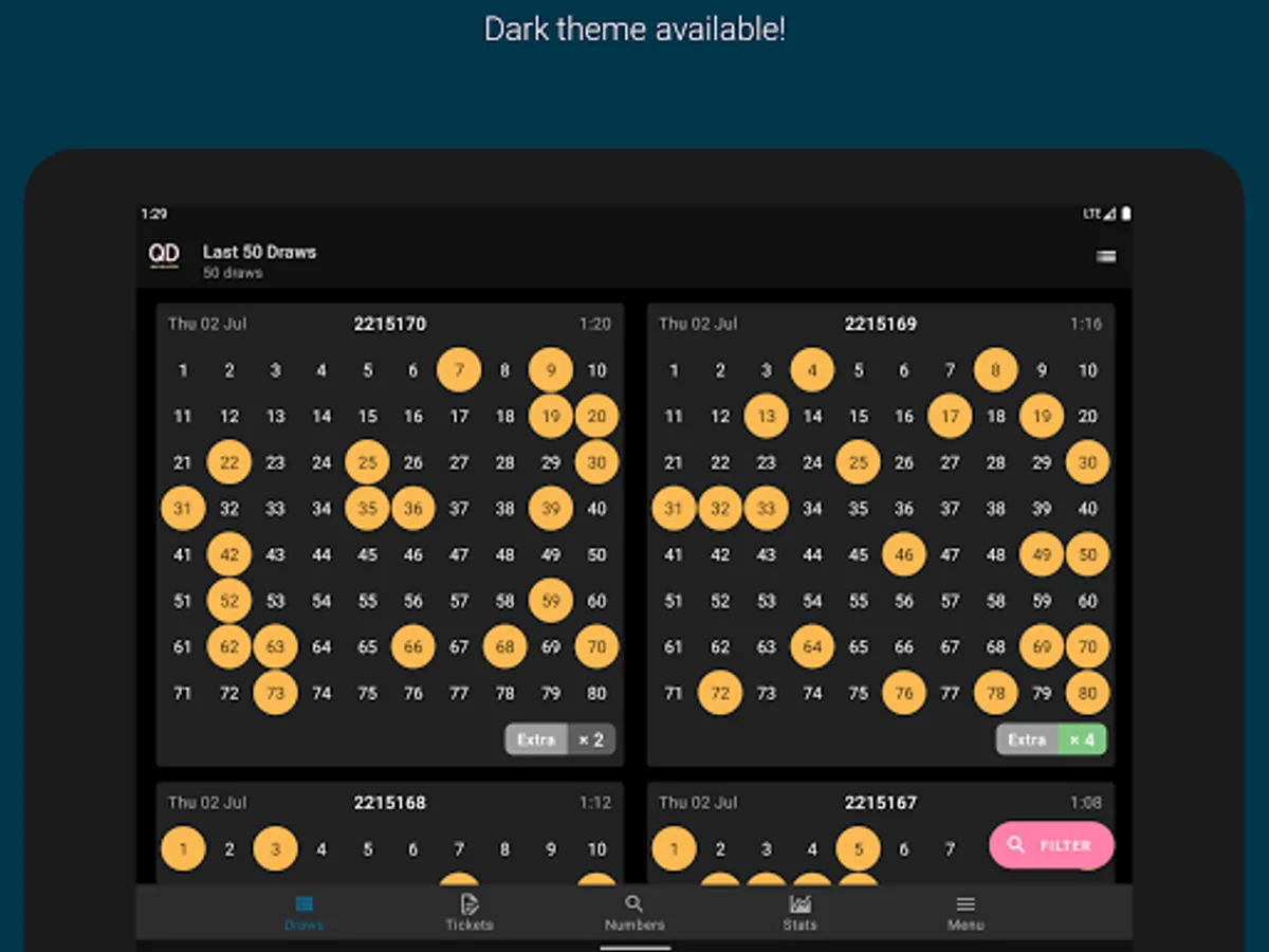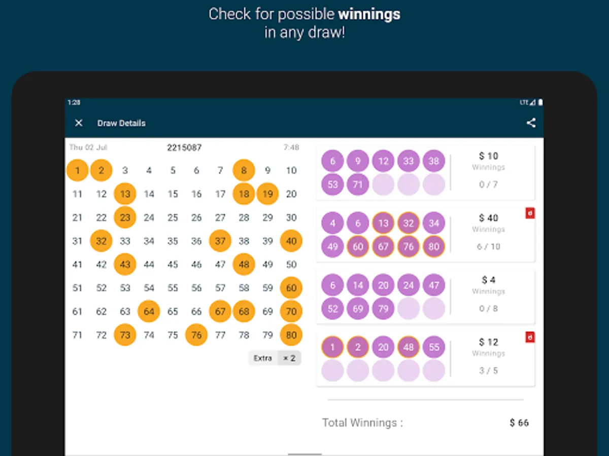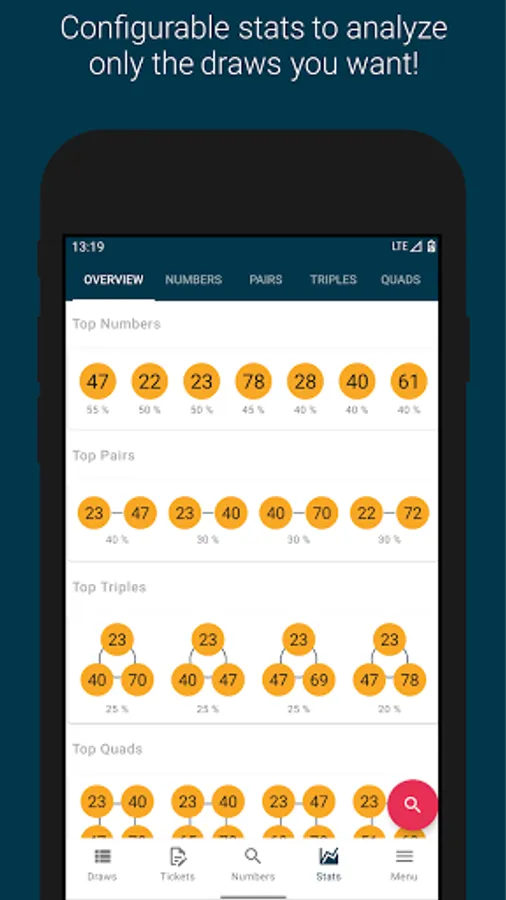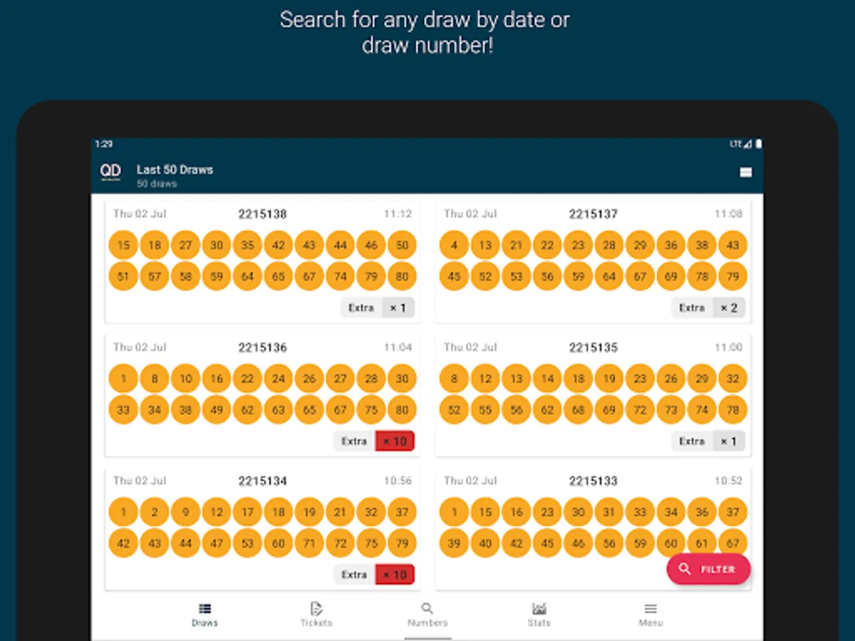 - View advanced stats, including top pairs, triples and quads for your selected draw range! This way you can improve your playing strategy and increase your winnings!.