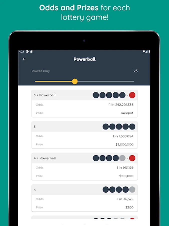 Currently, 5 lottery games are included : Powerball, MegaMillions, Lotto America, NY Lotto & Cash4Life.
