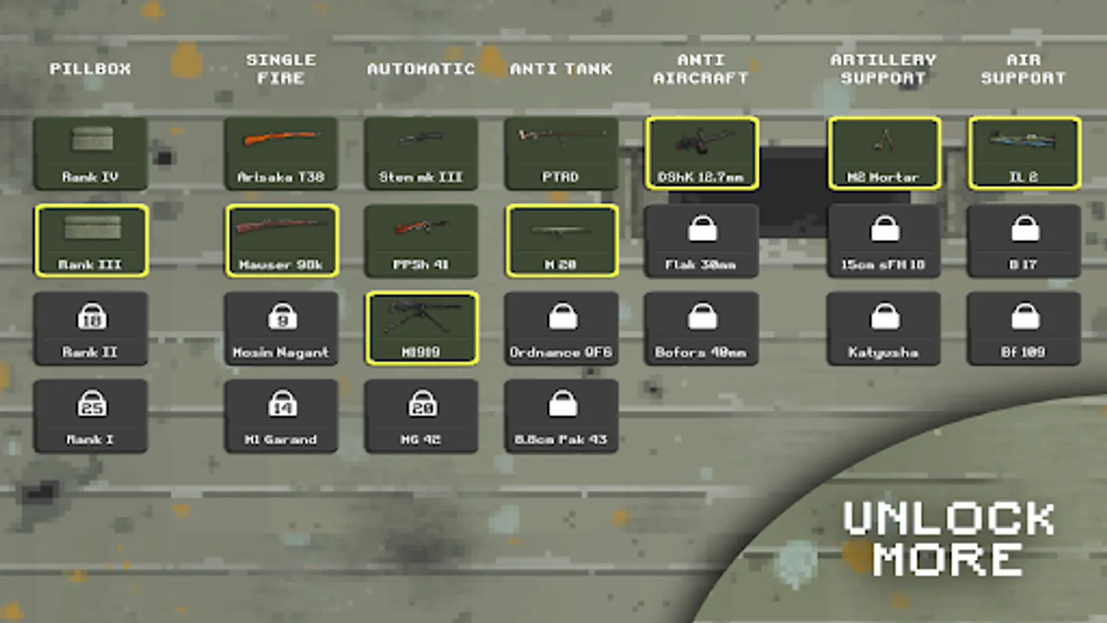 You start with a single bolt-action rifle, but over time, you can unlock more weapons. There is a better rifles, machine-guns, anti-tank and anti-air guns. You also have "rear forces", like artillery, and air-support.
