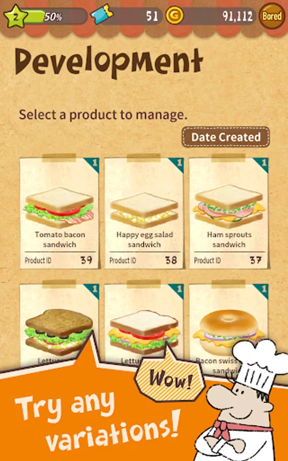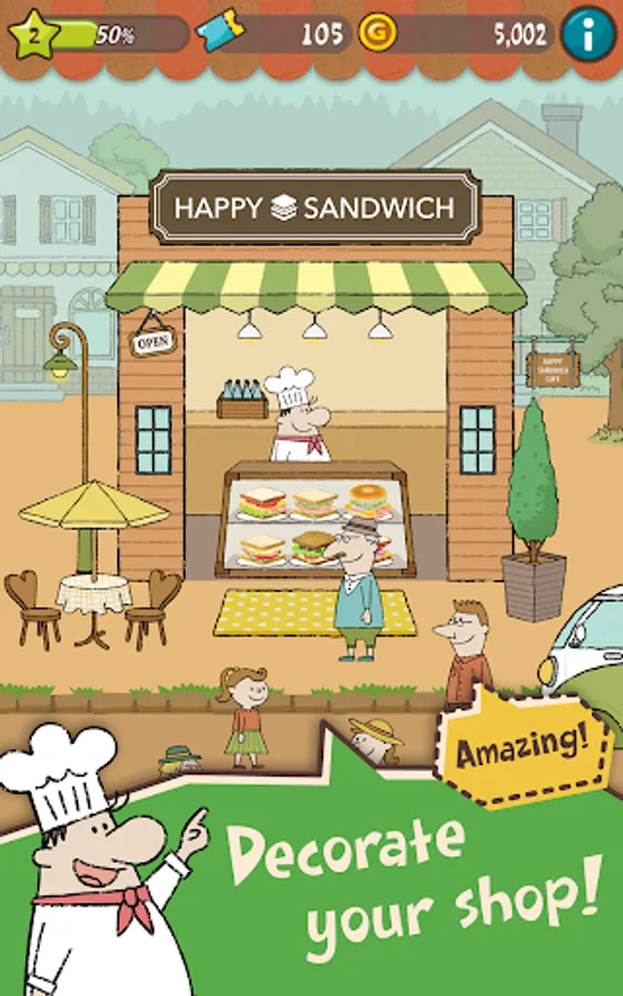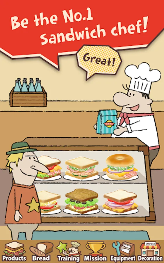 Use your favorite ingredients and make your very own original sandwiches! Make your shop popular by serving many sandwiches or decorating the shop as well as enjoy the story! Many addicting elements that keep you playing!