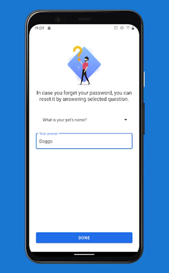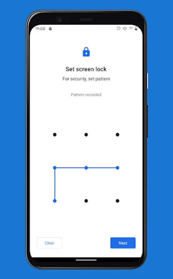 Open app -> Setup pattern/pin ->Enter recovery question and answer ->