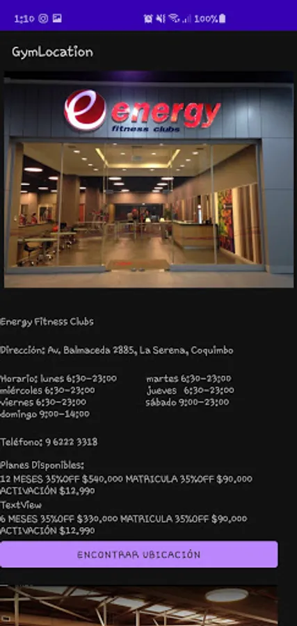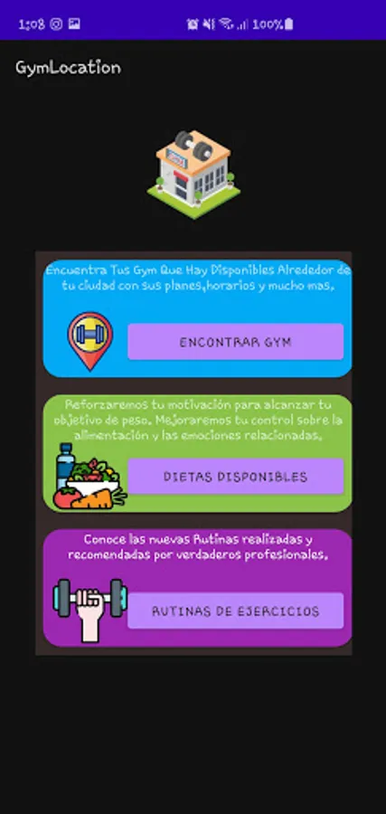 Gym Location is an application in which it shows the gyms around your city with their respective information (Schedule, Plans, Address, Photos, etc.), in addition to this, it has implemented Exercise Routines to perform at home without any problem. other Diets to keep your body healthy.