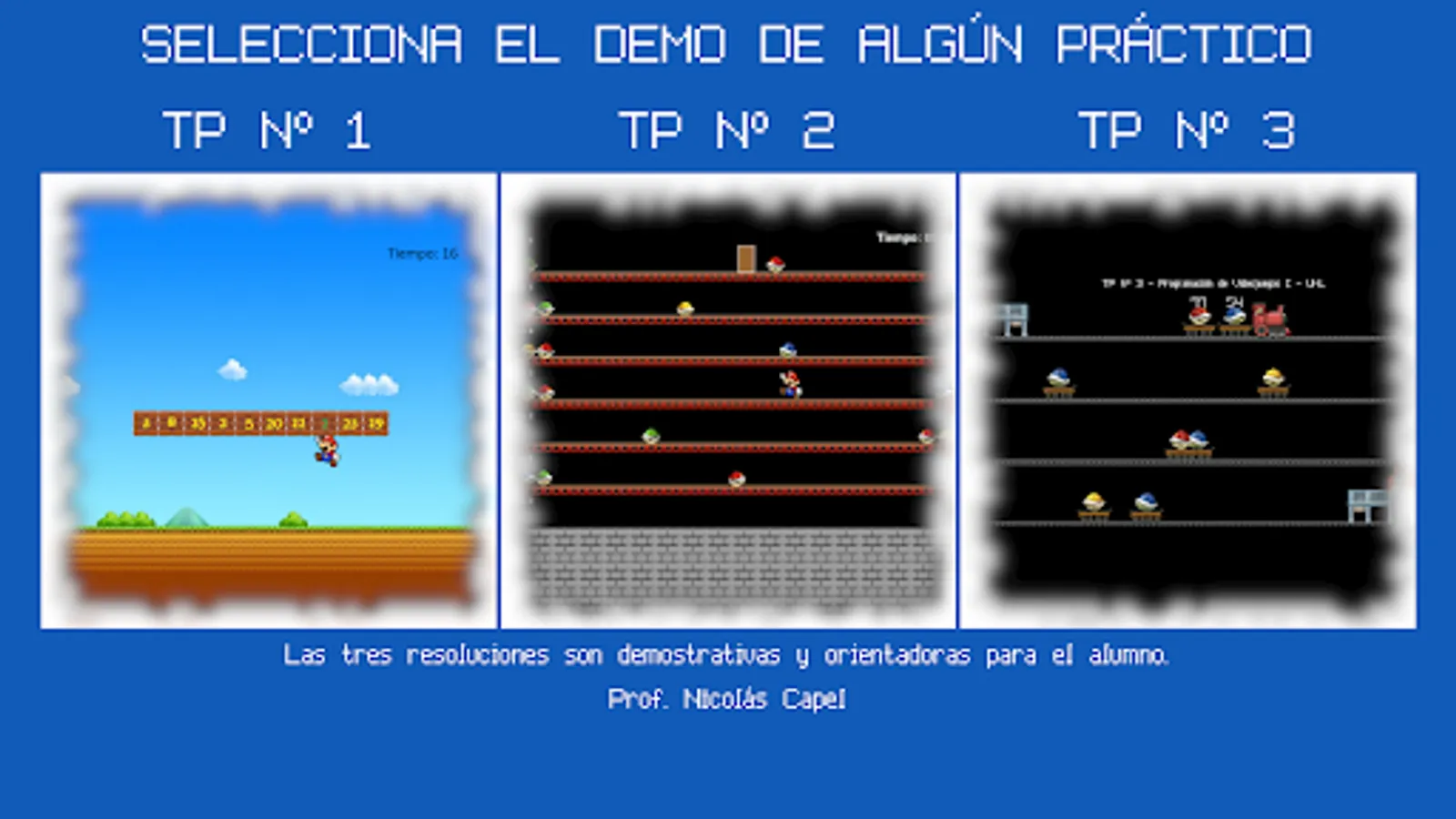 Demonstrations of resolution of Practical Works of the subject Videogame Programming I of the UNL-FICH Distance