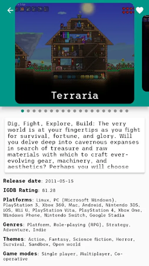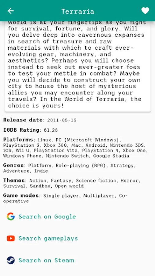 Have found your next game but don't have a place to save it? Want to have a list of your favourites games? Don't worry! This app has a favourites feature to add whatever game you wish.