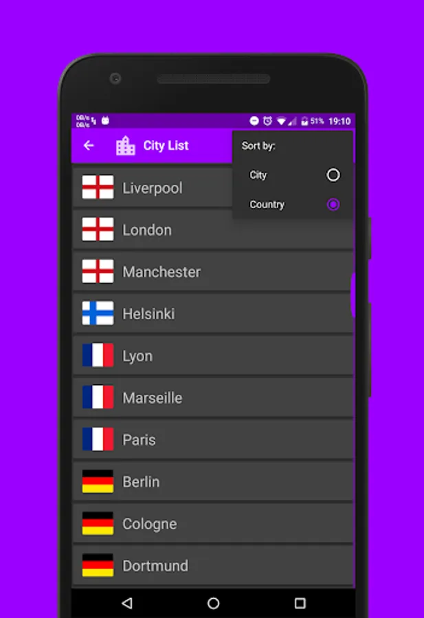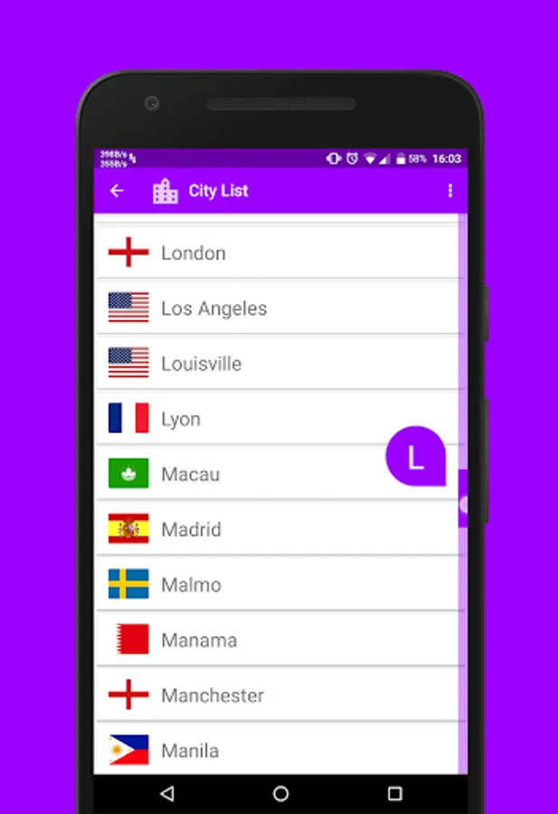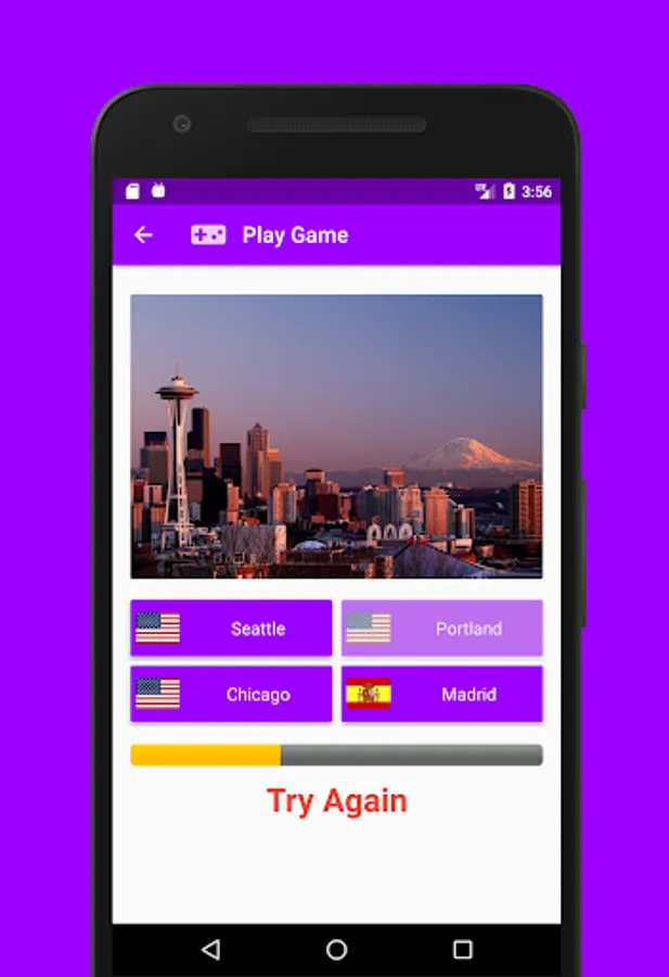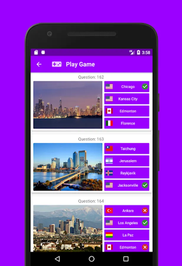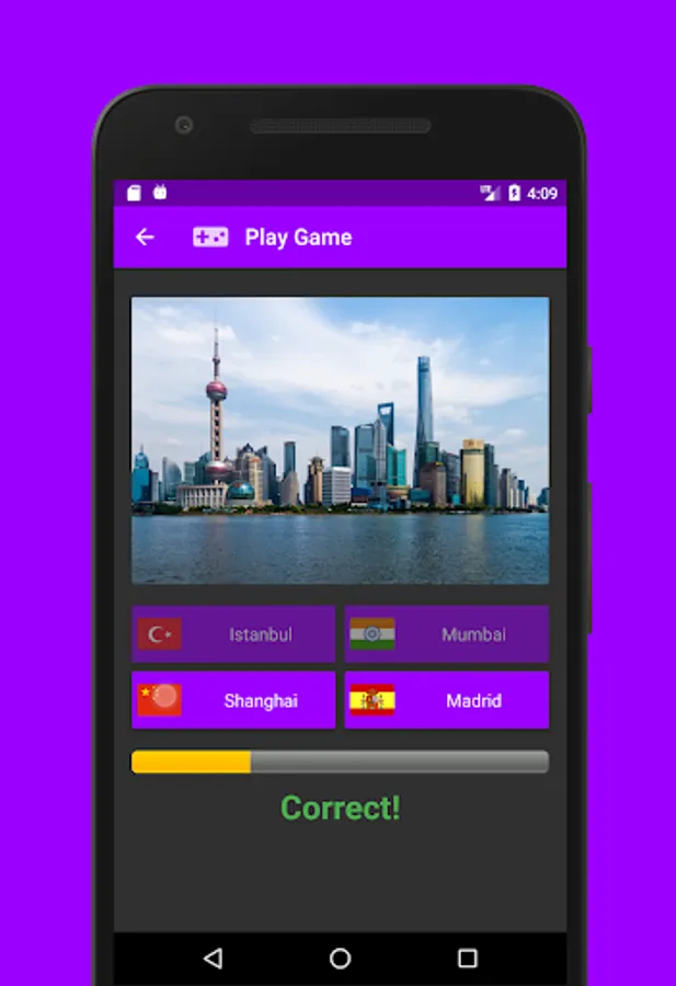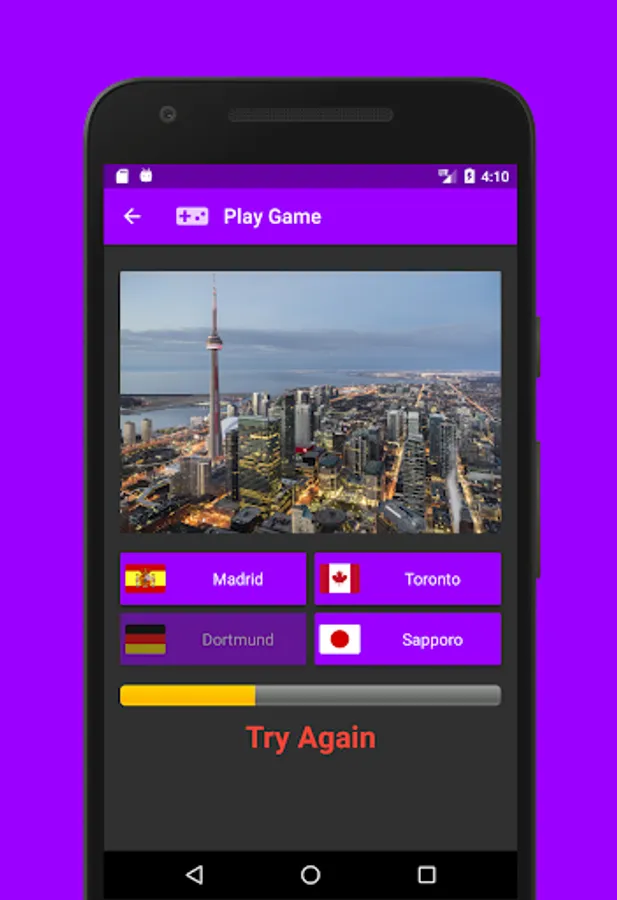 Multiple choice trivia game where you guess the skyline of a city from four given choices.