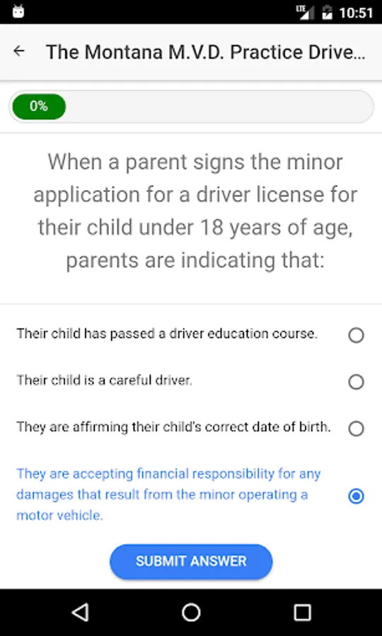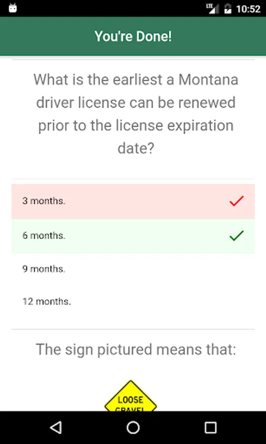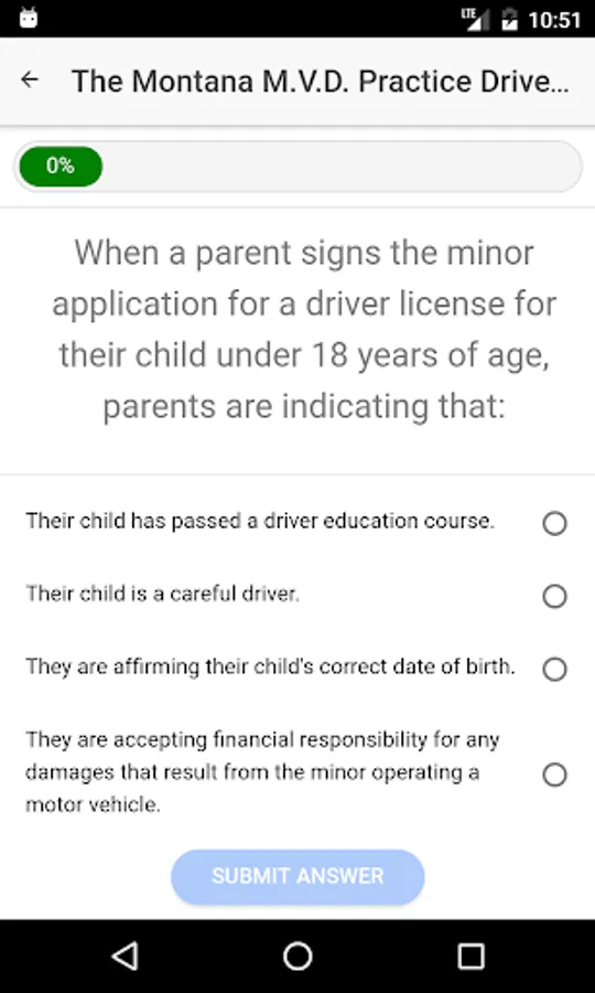 Test your knowledge about Montana's driving laws. Created by the State of Montana’s Motor Vehicle Division, the app offers you a chance to answer random questions based on the Montana Driver Manual. Use the test to prepare for a driver’s license exam or to refresh your knowledge about the State’s driving rules and laws. You can take the test as many times as you like, generating a new set of questions each time. At the end of each test, you’ll get a score, plus can view any correct and incorrect answers.