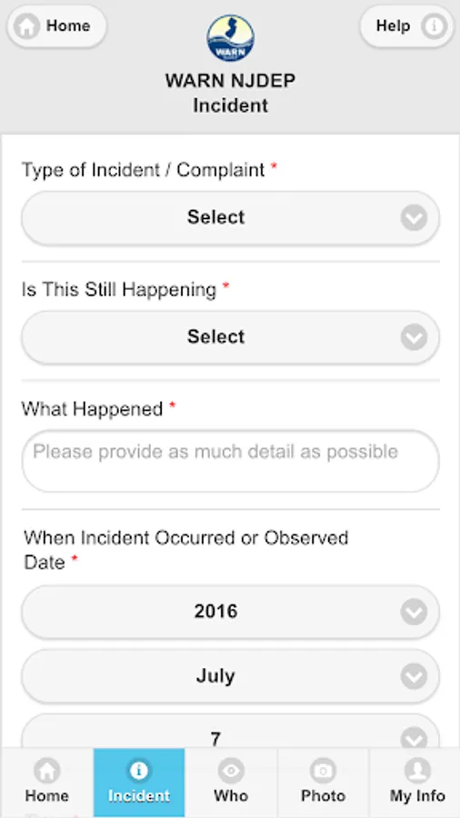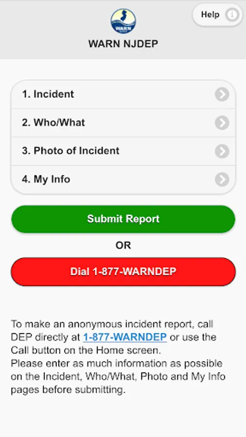 WARN NJ DEP allows you to submit information about environmental incidents, abuses and complaints in or impacting New Jersey directly to the New Jersey Department of Environmental Protection (NJDEP).