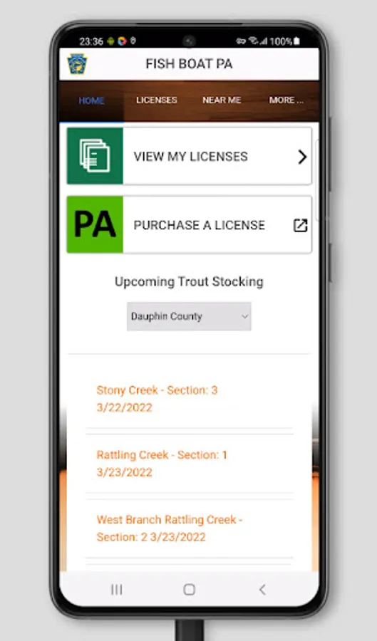 - Near Me mapping feature for locating boating access points, stocked trout streams and lakes, and where to purchase fishing licenses