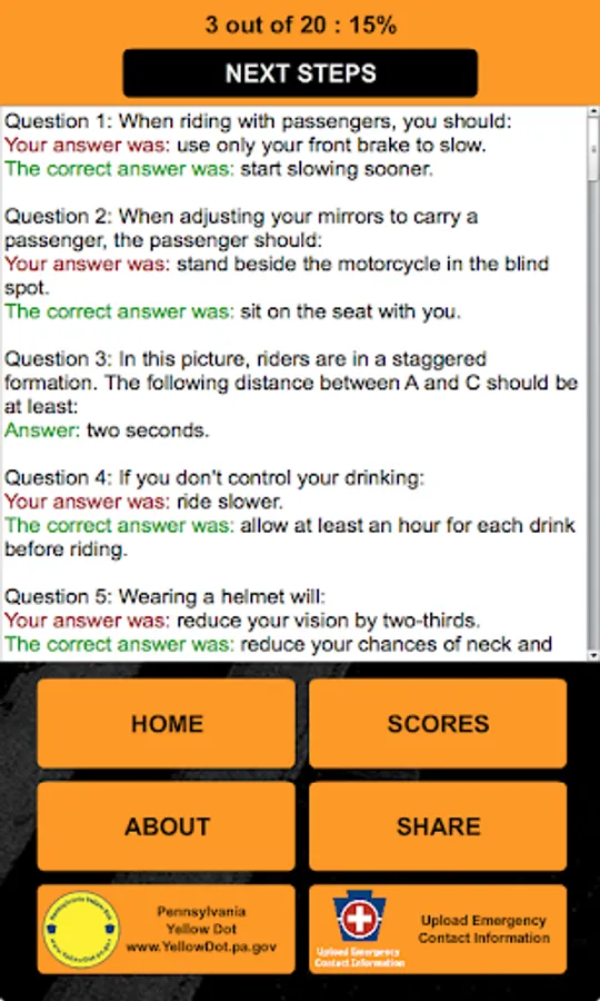 Use this PennDOT app for a realistic representation of the actual motorcycle knowledge test. Download the app for practice questions that will help you prepare for your PennDOT motorcycle knowledge test, or refresh your knowledge and become a better rider! The application will also host valuable information for licensed riders to stay safe, informed and compliant on the roads. When you’re done, you can share your scores with your friends and family via Facebook, Twitter or email.