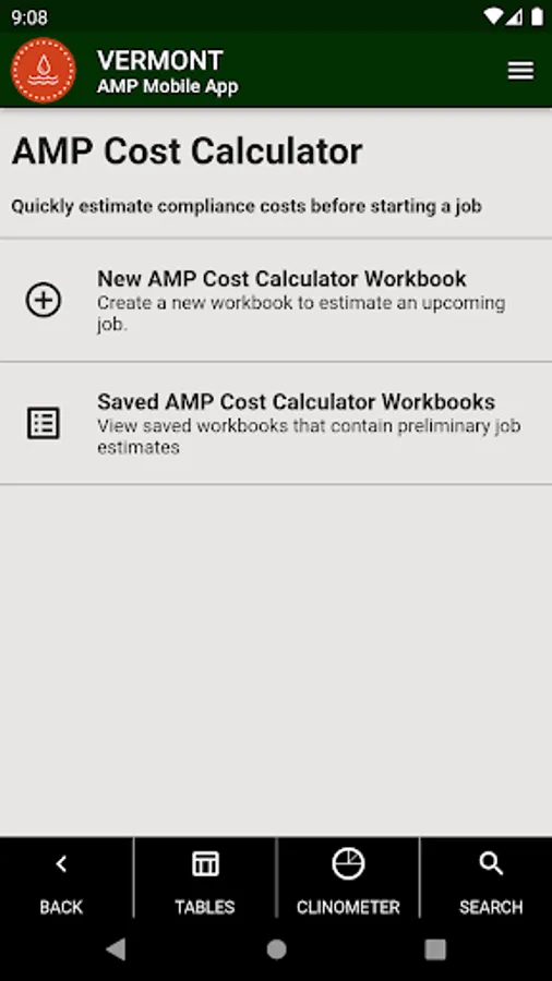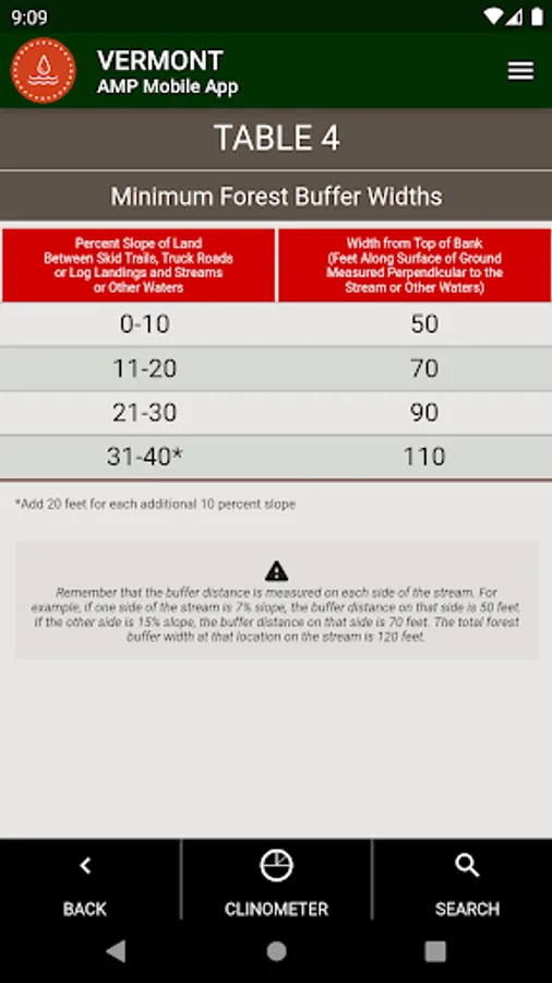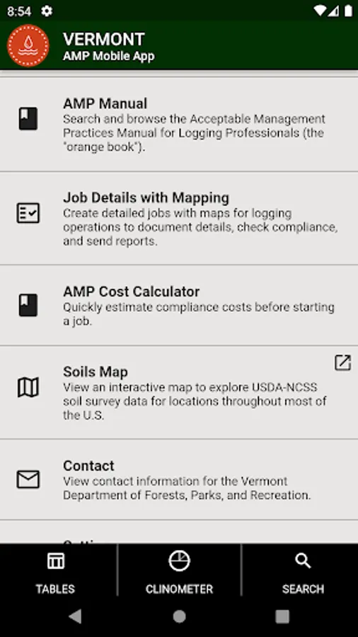 The AMP mobile app from the Vermont Department of Forests, Parks, and Recreation provides a digital version of the Acceptable Management Practices Manual for Logging Professionals as well as several tools to assist in estimating and tracking water quality compliance practices.