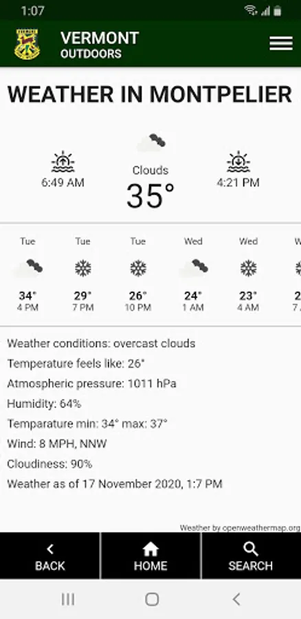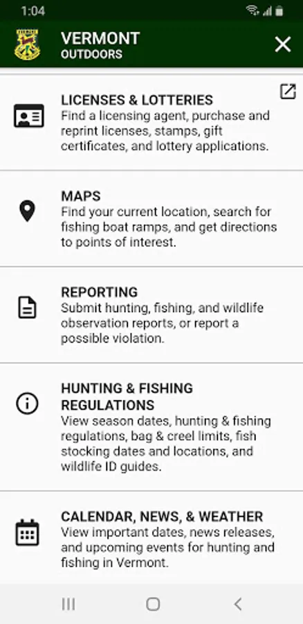 Vermont Outdoors is the official outdoor recreation app from the Vermont Department of Fish & Wildlife and provides a wide variety of tools and information for hunting, trapping, fishing, and other outdoor activities in the State of Vermont. Browse interactive maps to find points of interest, search for information on regulations and policy, submit reports to Vermont state agencies, and more.