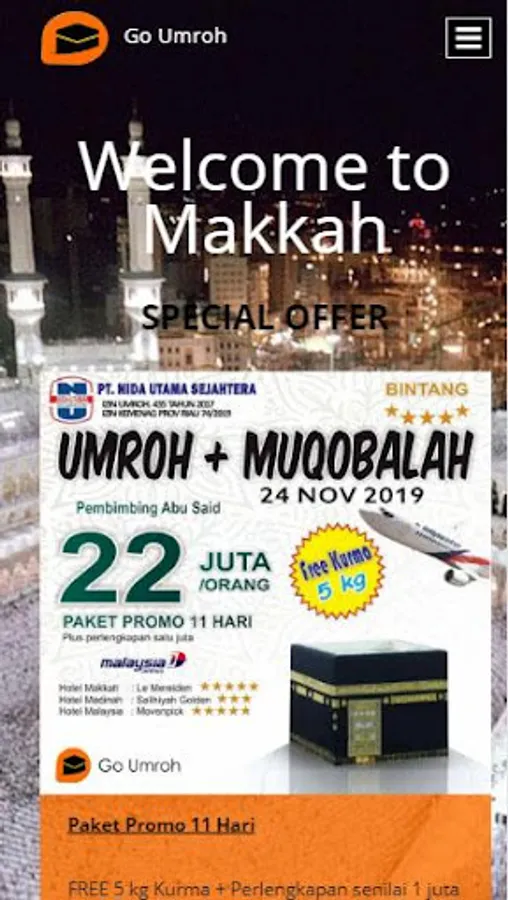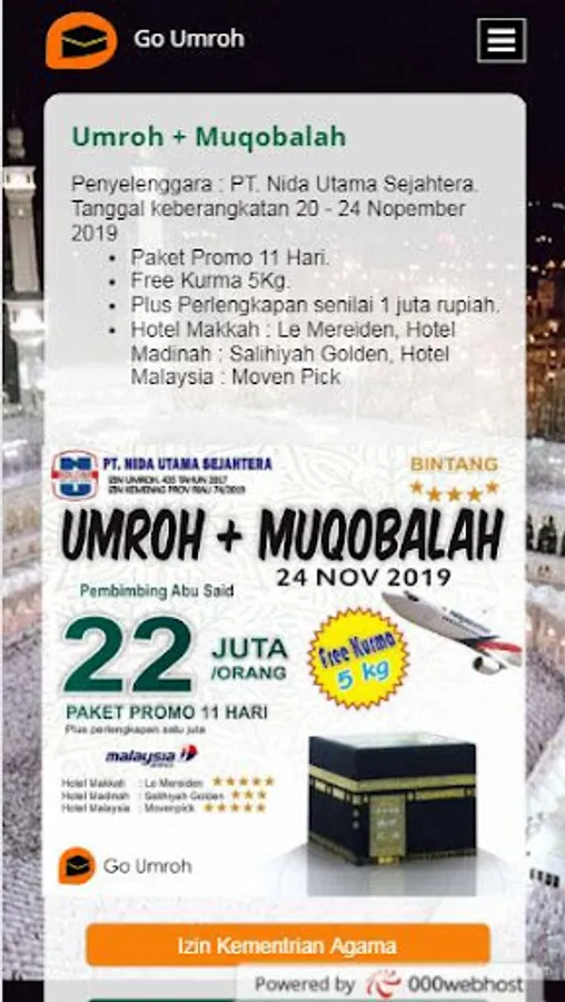 Go Umroh - PT. Nida Utama Sejahtera is here to provide "Direct Departure Without Waiting" solutions with many departure options, which will easily adjust your schedule. Comfortable travel with the best non-transit airlines, the best hotel full board dining facilities. Services before departure, services during Umrah, until pilgrims return to Indonesia we serve wholeheartedly for 24 hours by a team of professionals and competent in their fields. PT. Nida Utama Sejahtera (Go Umroh) is a member, and has also been authorized by the Ministry of Religion with number 435 in 2017.
