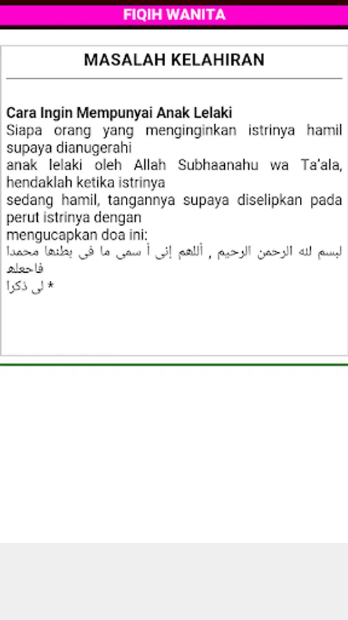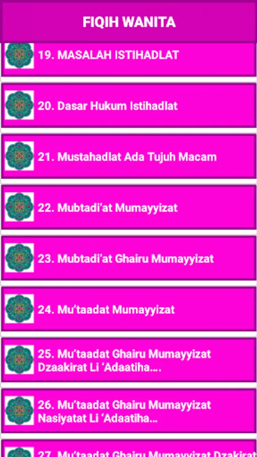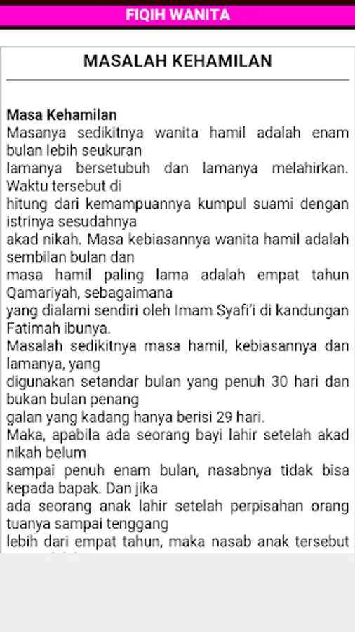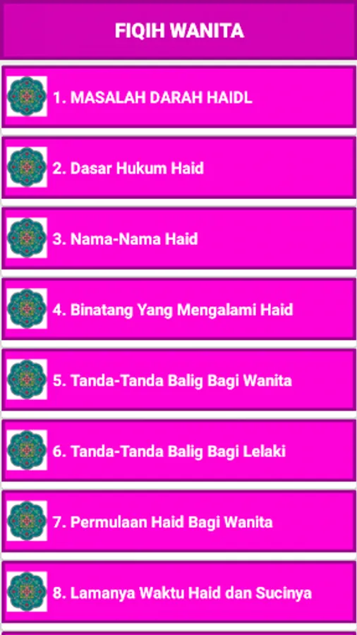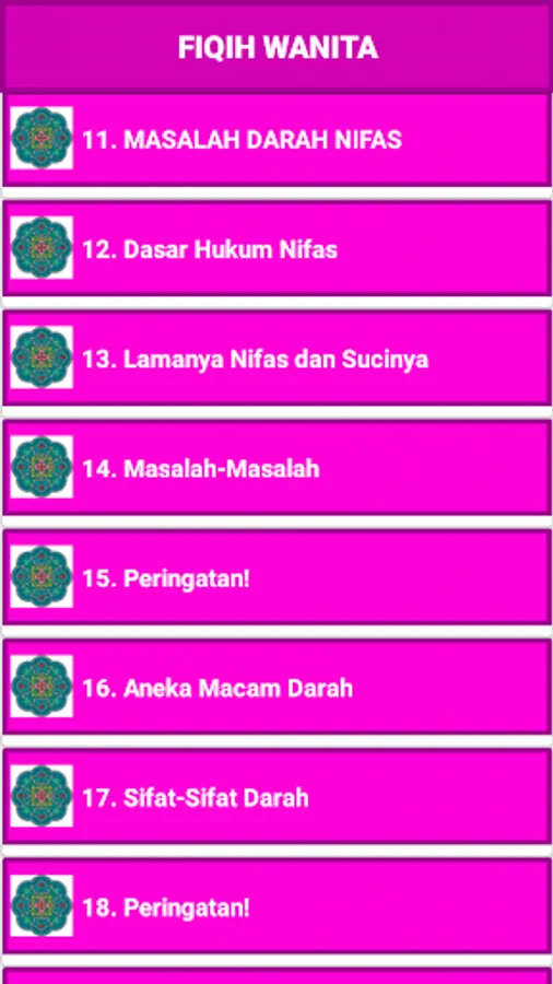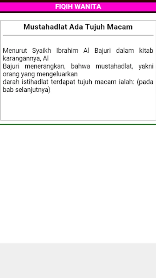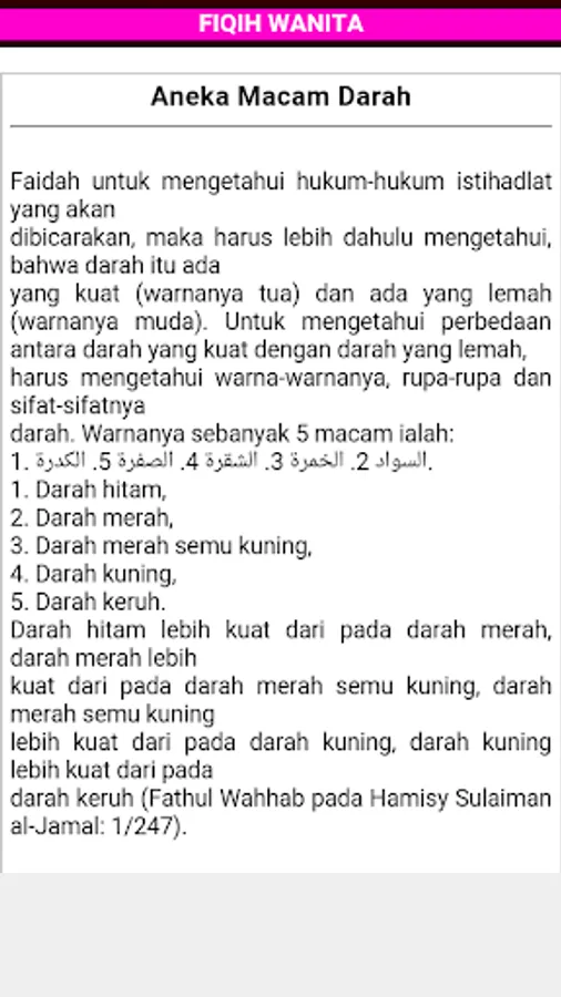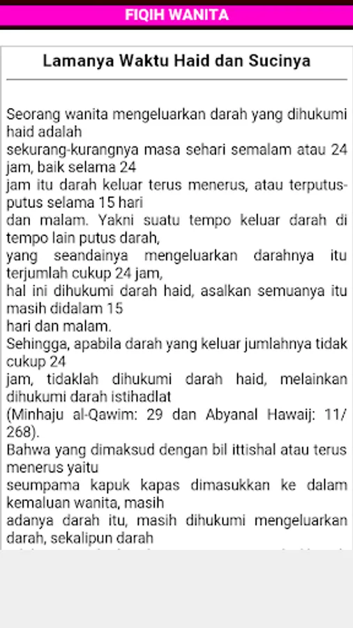 Fiqih Wanita adalah aplikasi yang membahas darah wanita ; Haidl, Nifas, , Istikhadlah serta permasalahannya. Wajib 'ain bagi kaum wanita untuk mempelajari dan mengerti tentang pembahasan darah wanita ; Haidl, Nifas, Istikhadlhah dan semua permasalahannya yang berkaitan dengannya. Aplikasi ini cocok bagi anda kaum wanita untuk mempelajari darah wanita, namun juga tidak menutup kemungkinan bagi kaum pria untuk mempelajarinya sehingga jika nanti istrinya tidak paham dan mengerti maka yang wajib memberi ilmu adalah suaminya.