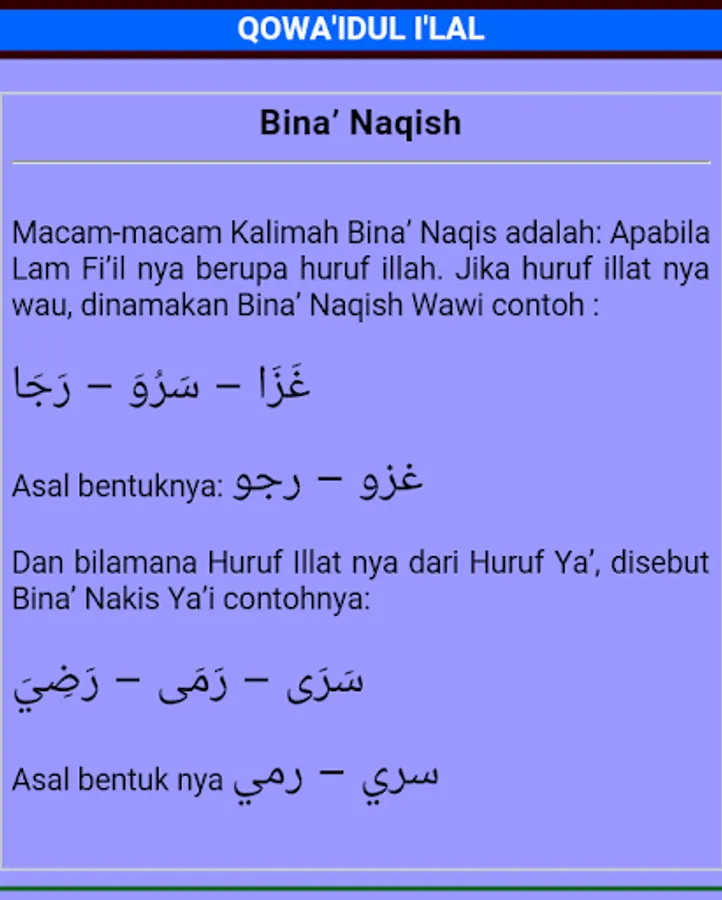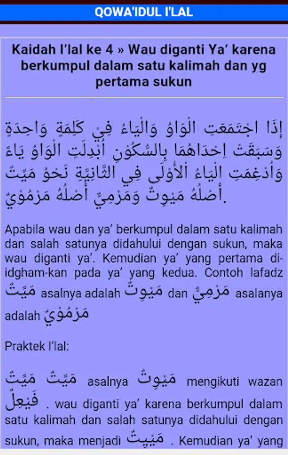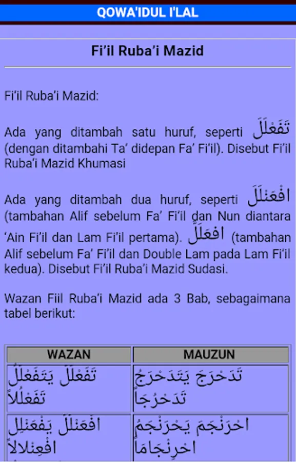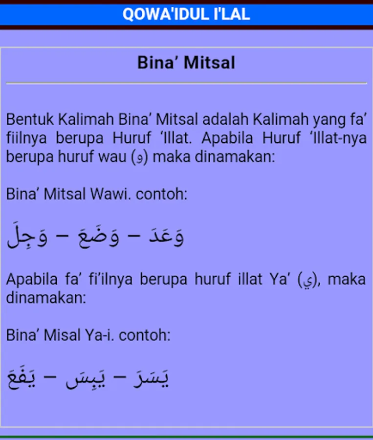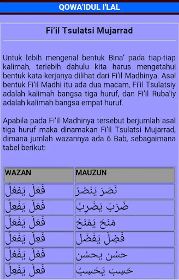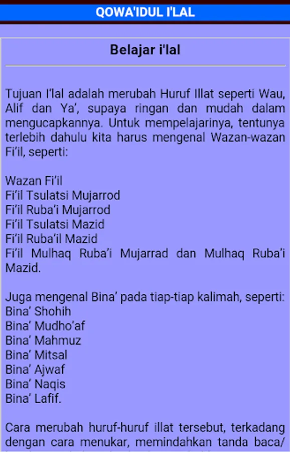 Puji syukur kepada Tuhan Yang Maha Kuasa akhirnya kami team developer google telah berhasil membuat aplikasi Qowaidul I'lal. Aplikasi ini merupakan terjemah Bahasa Indonesia dalam kitab Qowaidul I'lal dimana di dalamnya membahasa kaidah kaidah ilmu shorof (perubahan perubahan kata) dalam
