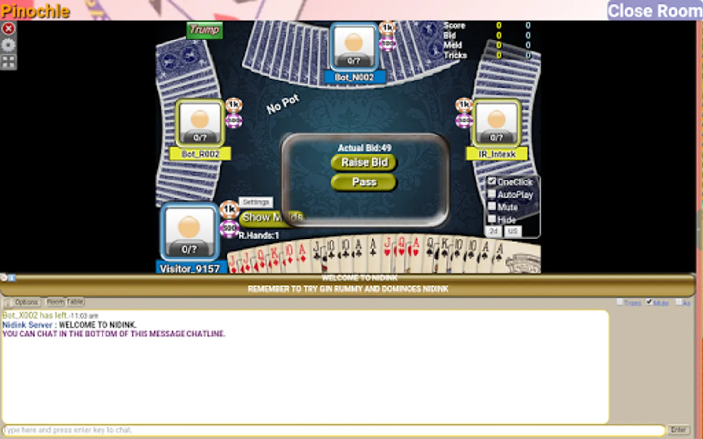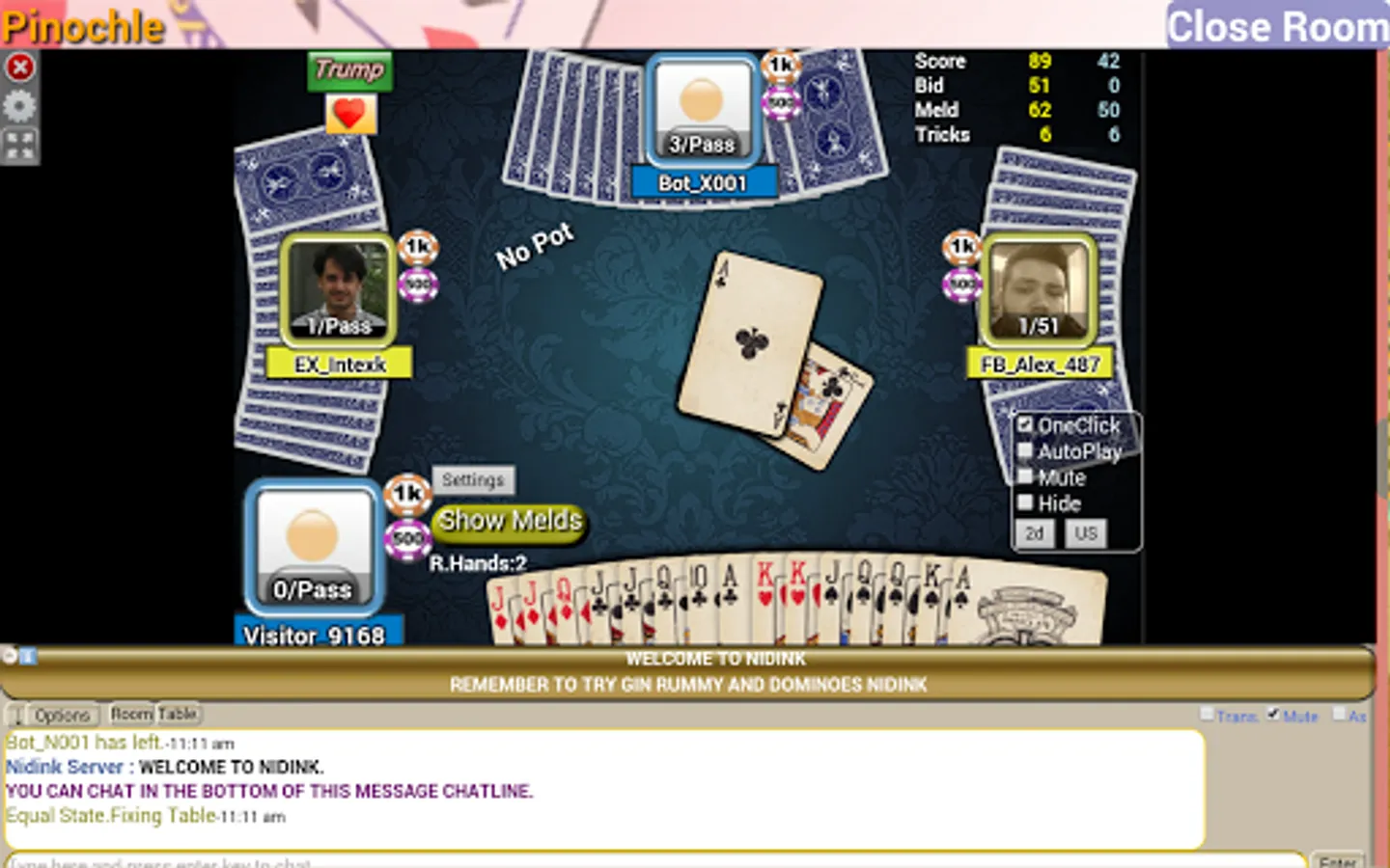 Play Pinochle in a mutiplayer online environment with your friends or new people.