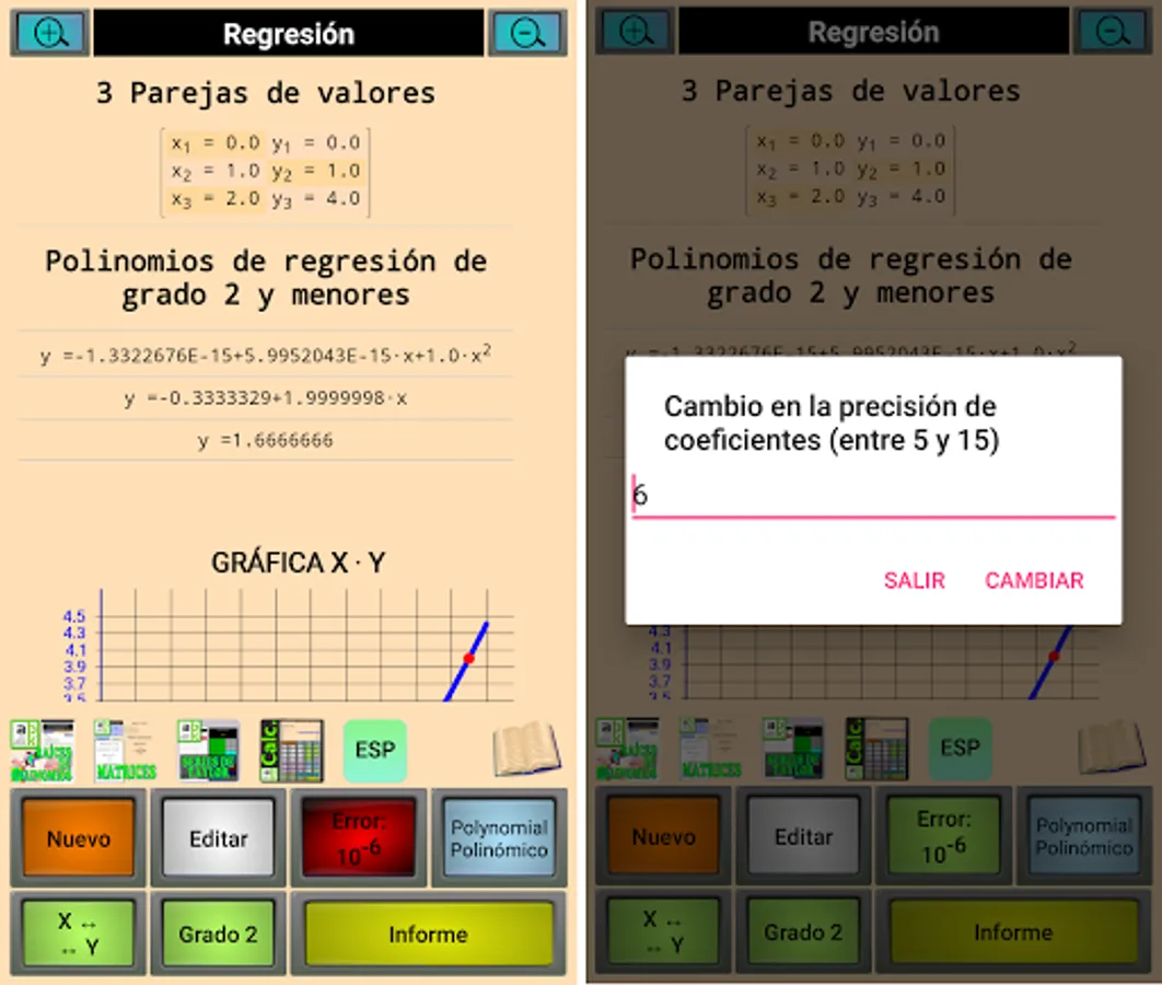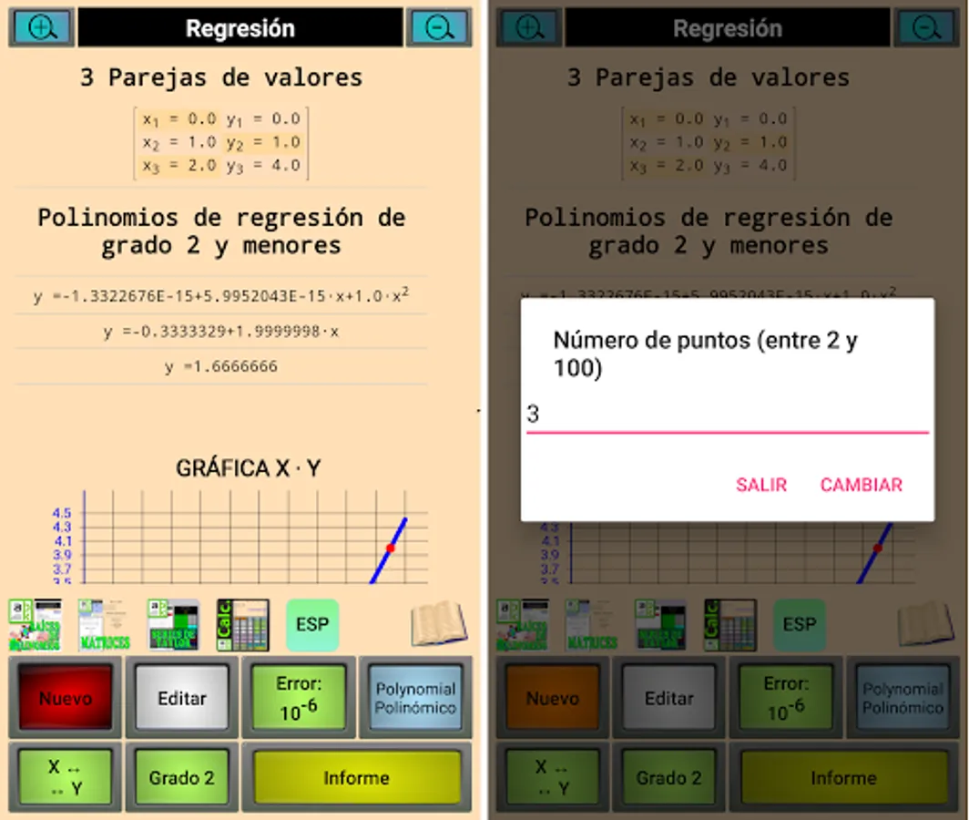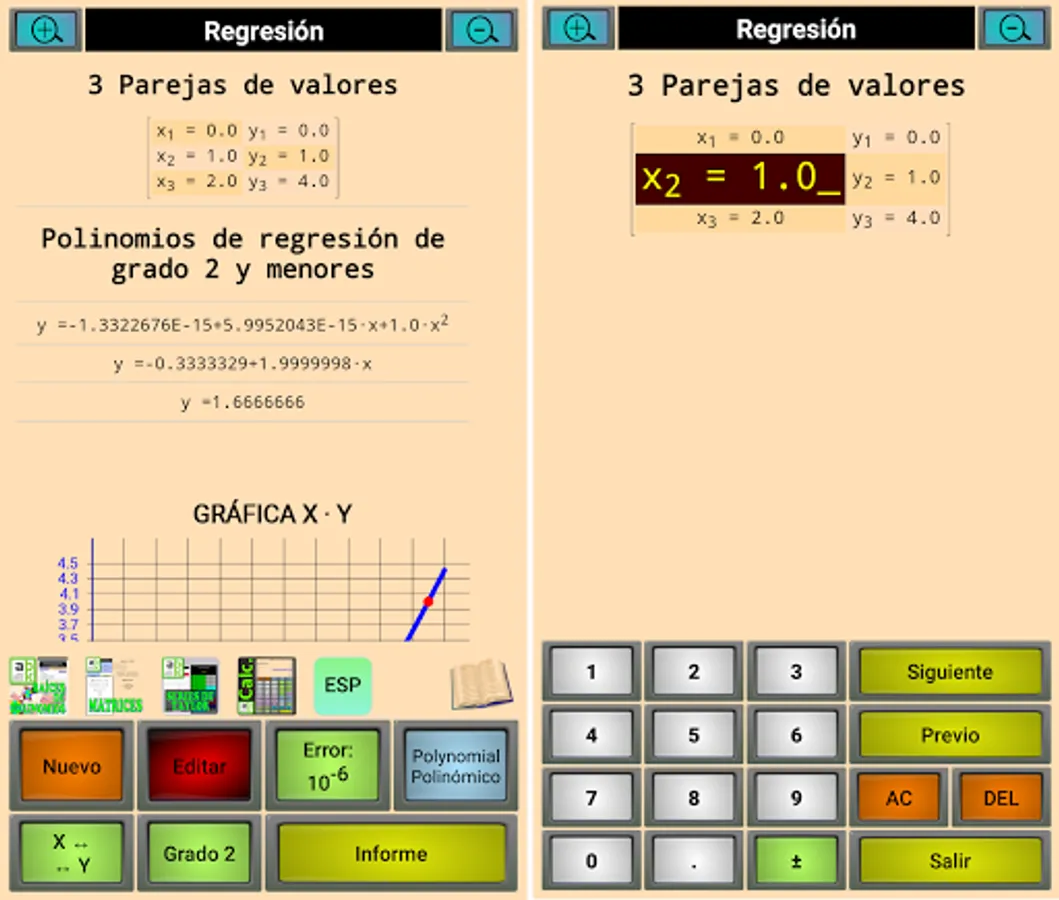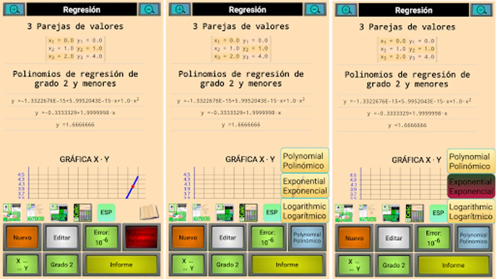 It also allows the export in HTML format with the enumeration of the statistical data, the different polynomials / regression functions found by the minimum squared error method and the graph of the function.