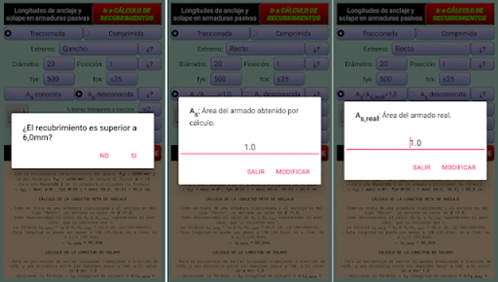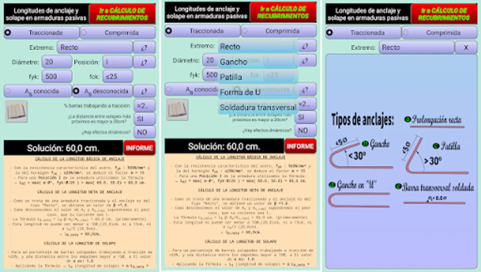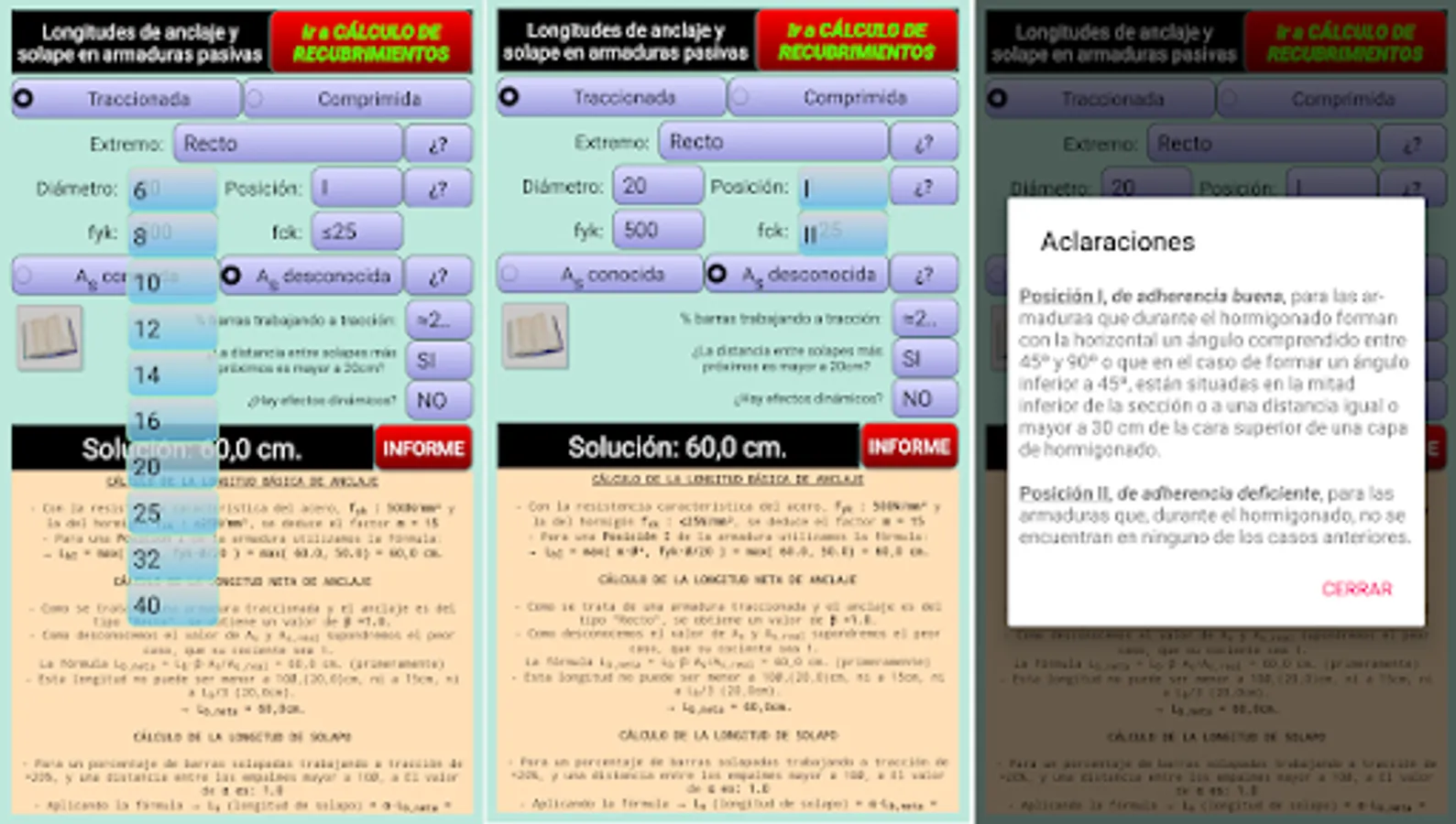 This application makes the simple calculation of the anchorage and / or overlap length of our passive reinforcement as well as its minimum coatings. The idea is to have an application that helps us on site or at a stage of sizing and / or drawing of the ferralla in plans.