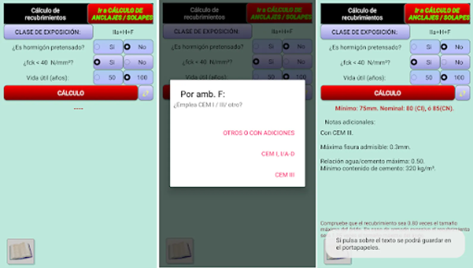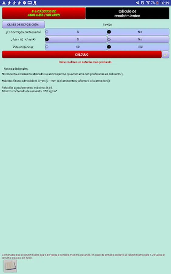 For the calculation of coatings, it calculates the minimum coating of the reinforcements in reinforced concrete, the minimum crack, the maximum water / cement ratio and minimum cement content.