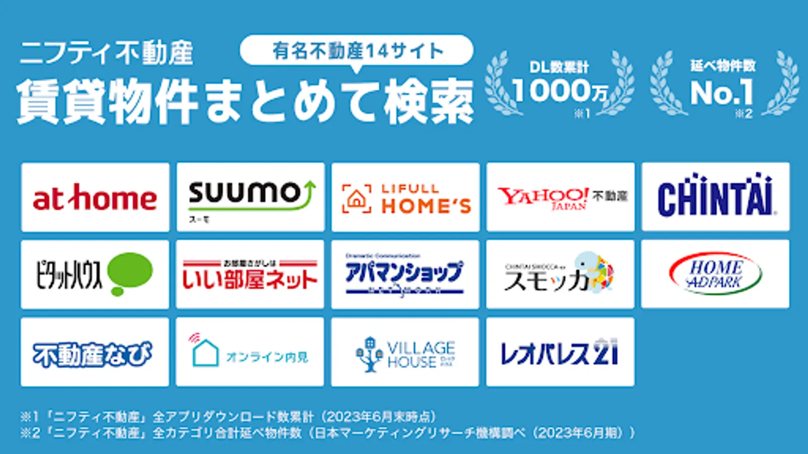 (* 2) Total number of properties in all categories of “Nifty Real Estate” (according to Japan Marketing Research Organization (June 2023)), this app only lists rental properties