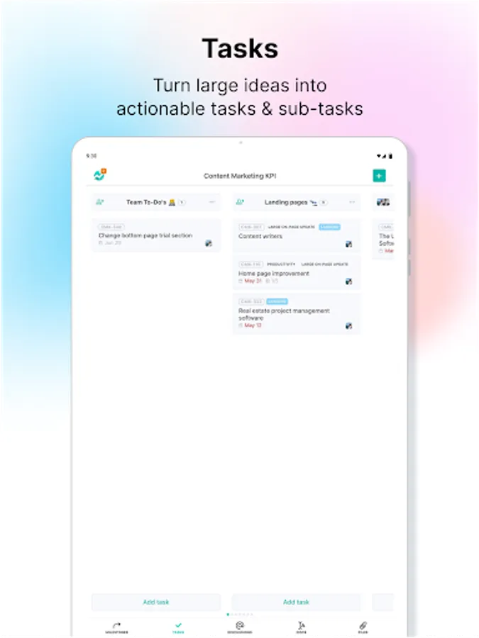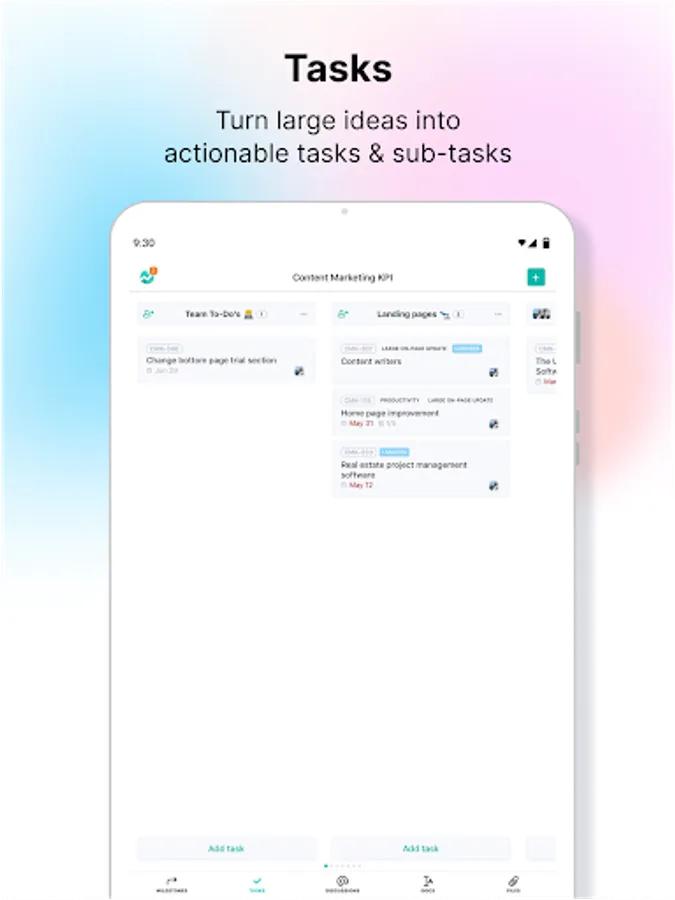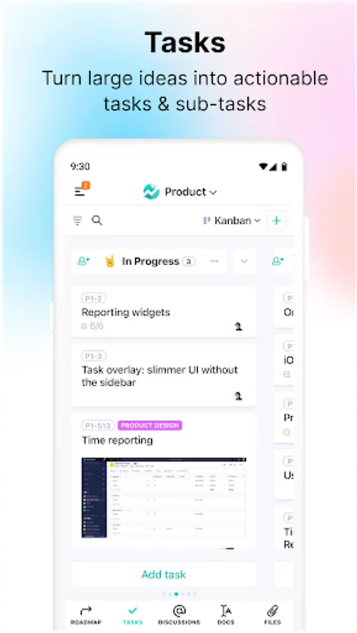 Tasks - Break a large idea into actionable subtasks. No more guessing who’s doing what. With custom task-lists, you can mold each project to follow your specific workflow.