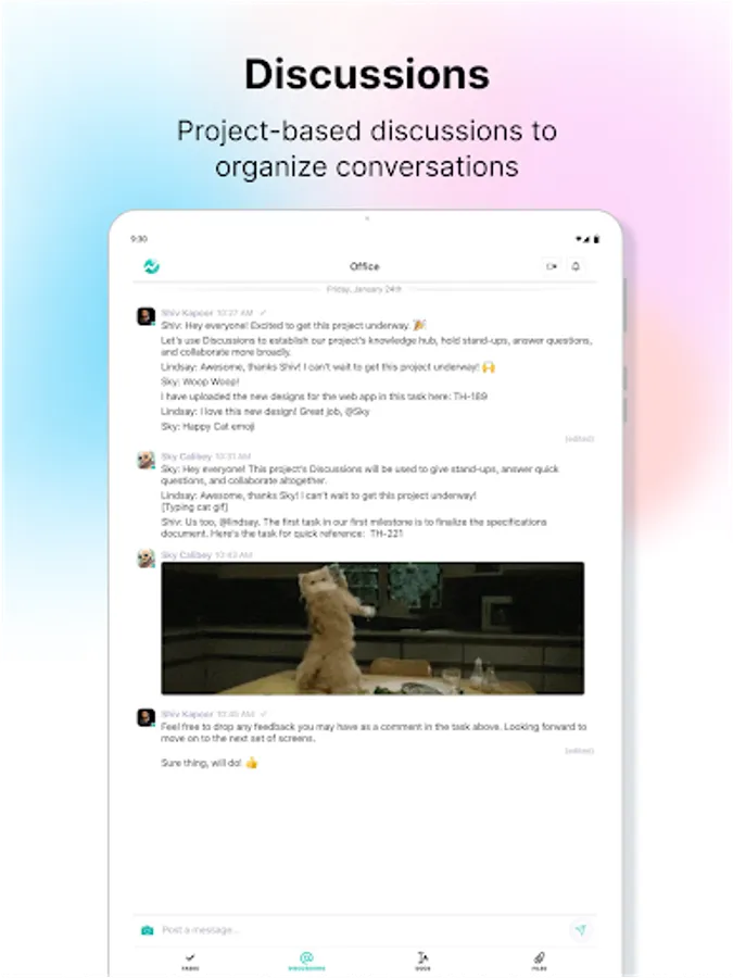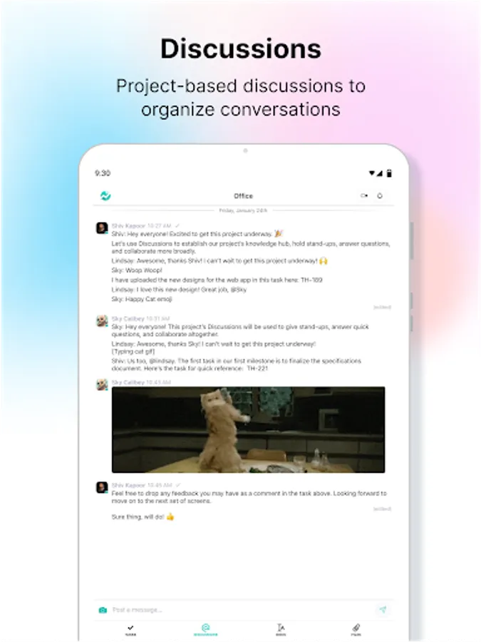 Discussions - Project based discussion channels allow for robust internal or client-facing collaboration. Easily organize your discussions into teams, topics or anything else.