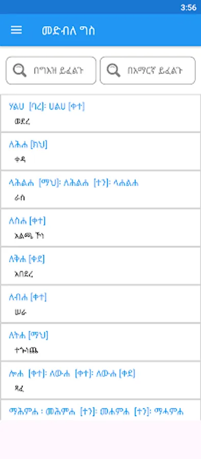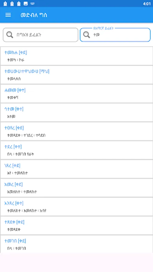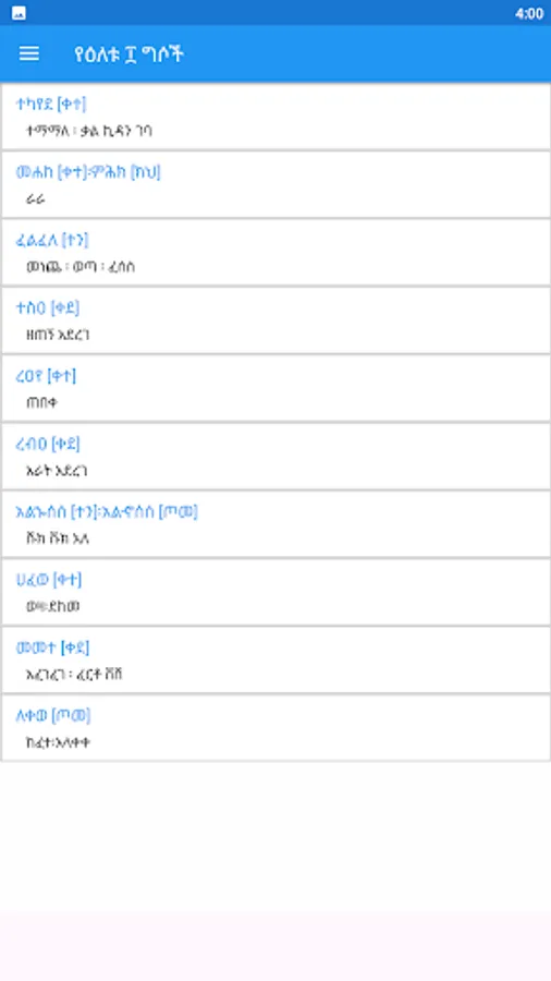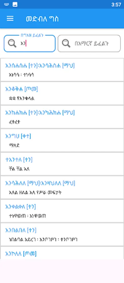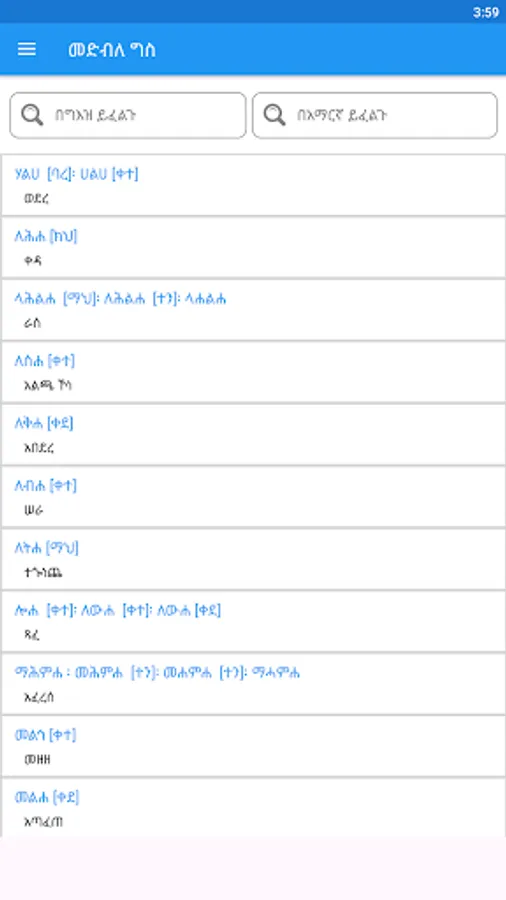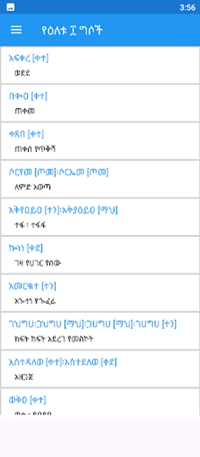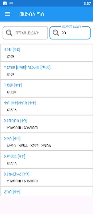 This ግእዝ መድብለ ግስ|Geez Verb study application is an essential tool for anyone studying the Geez language or seeking a better understanding of Ethiopian ancient literature and wisdoms. The application provides a comprehensive resource for translating Geez verbs into Amharic which is essential to study the language. With its user-friendly interface and extensive database, the application is valuable aid for learners at all levels, from beginners to advanced students. Overall, the Geez Verbs dictionary application represents a highly useful and convenient means of unlocking the wealth of knowledge contained within the Geez language.
