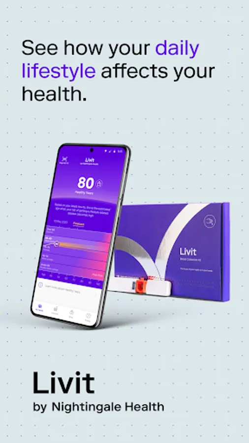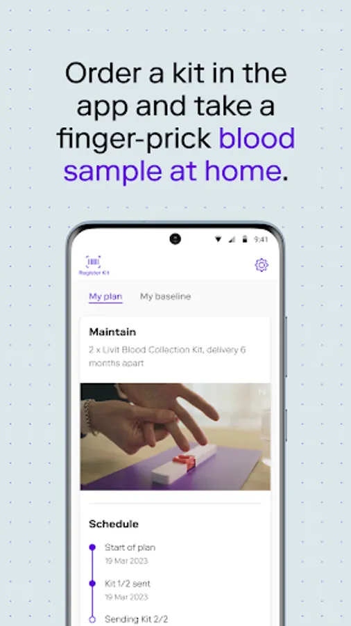 Collecting a finger-prick blood sample is easy with our Livit Blood Collection Kit. Purchase a health plan with your preferred number of Livit Blood Collection Kits per year. Collect 4–5 drops of your blood, mail your sample, and sit back while we analyze it. Finally, receive an extensive set of health results to the Livit app.