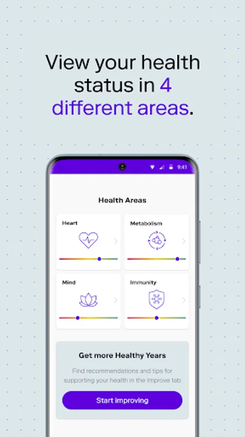 Our simulation tool helps you get an idea of how your results could develop. Based on this scenario, you’ll get personalized recommendations for improving the wellbeing of your body and mind. You’ll gain research-based knowledge about how lifestyle choices affect different Health Areas: Heart, Metabolism, Mind and Immunity.