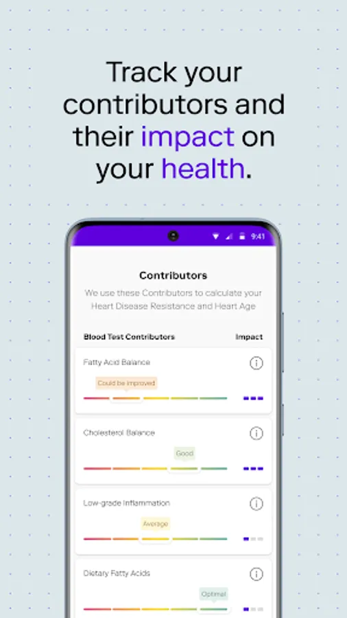 Finger-prick blood sample at home – Results to app – Holistic view of your health – Comparison to population data – Unique health prediction algorithms – Database of hundreds of thousands of samples – Tools for improving your health – Genetic disease risk